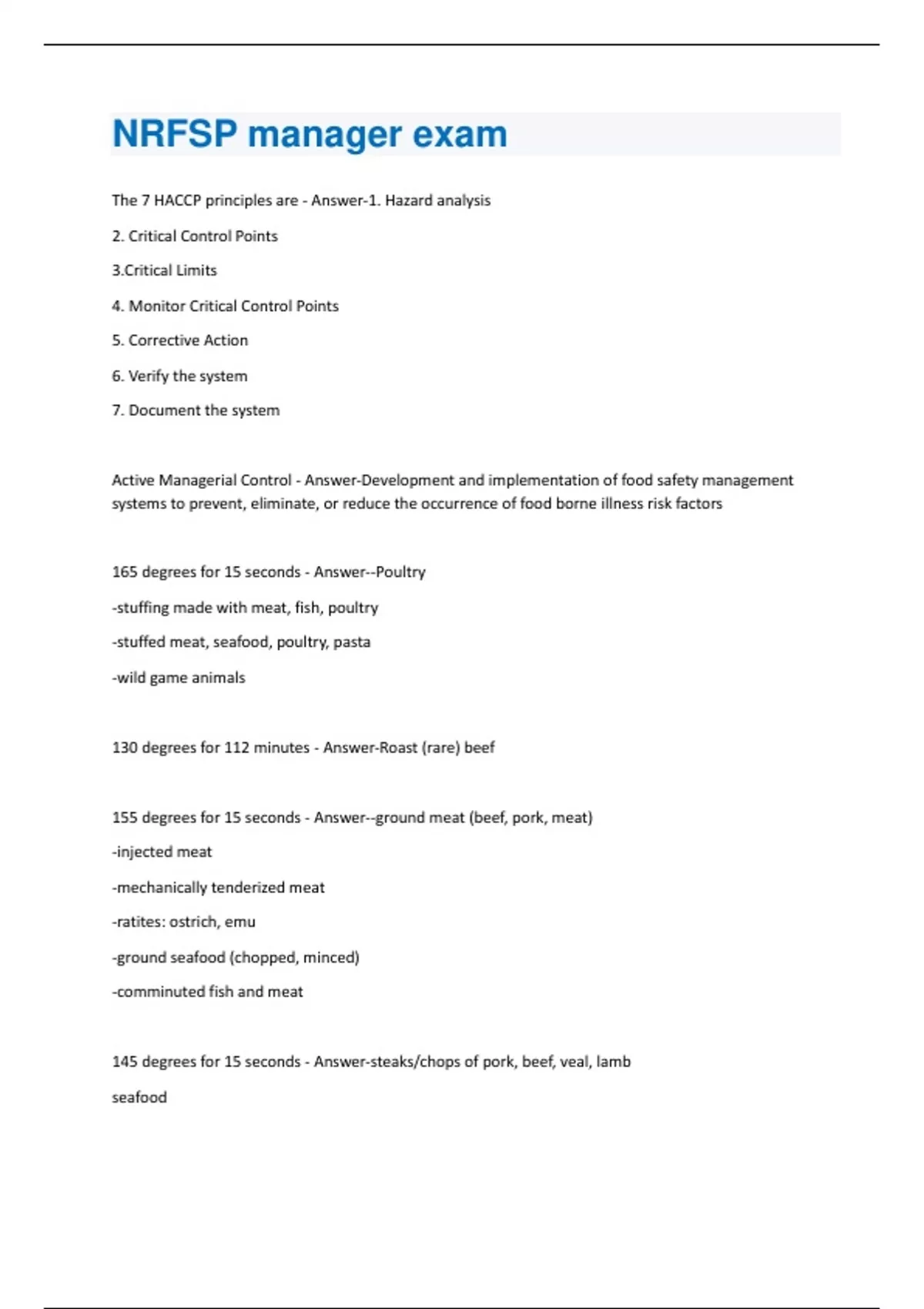 The 7 HACCP principles are - Answer-1. Hazard analysis 2. Critical Control Points 3.Critical Limits 4. Monitor Critical Control Points 5. Corrective Action 6. Verify the system 7. Document the system Active Managerial Control - Answer-Development and implementation of food safety management systems to prevent, eliminate, or reduce the occurrence of food borne illness risk factors 165 degrees for 15 seconds - Answer--Poultry -stuffing made with meat, fish, poultry -stuffed meat, seafood, poultry, pasta -wild game animals 130 degrees for 112 minutes - Answer-Roast (rare) beef 155 degrees for 15 seconds - Answer--ground meat (beef, pork, meat) -injected meat -mechanically tenderized meat -ratites: ostrich, emu -ground seafood (chopped, minced) -comminuted fish and meat 145 degrees for 15 seconds - Answer-steaks/chops of pork, beef, veal, lamb seafoodcommercially raised game shell eggs immediately served 155 degrees for 5 seconds - Answer-Shell eggs hot held 165 degrees for 15 sec., minimum internal cooking temp. + 2 minutes - Answer-All microwaved cooked food 145 degrees and external surface must have cooked color change - Answer-Steaks T/F: A food borne outbreak is defined as "the occurrence of two or more cases of a similar illness that result from eating a common food" - Answer-True Who publishes and updates the Food Code - Answer-FDA Contaminant - Answer-Any substance or object in food that makes the food harmful or objectionable. The word "adulterant" is also sometimes used What are the three forms of food hazards - Answer-1. Biological 2. Chemical 3. Physical 6 places that bacteria come from - Answer-1. Raw food 2. Water 3. Soil 4. People 5. Pests and pets 6. Air, dust, dirt, food waste Trichina (Trichinella Spiralis) - Answer