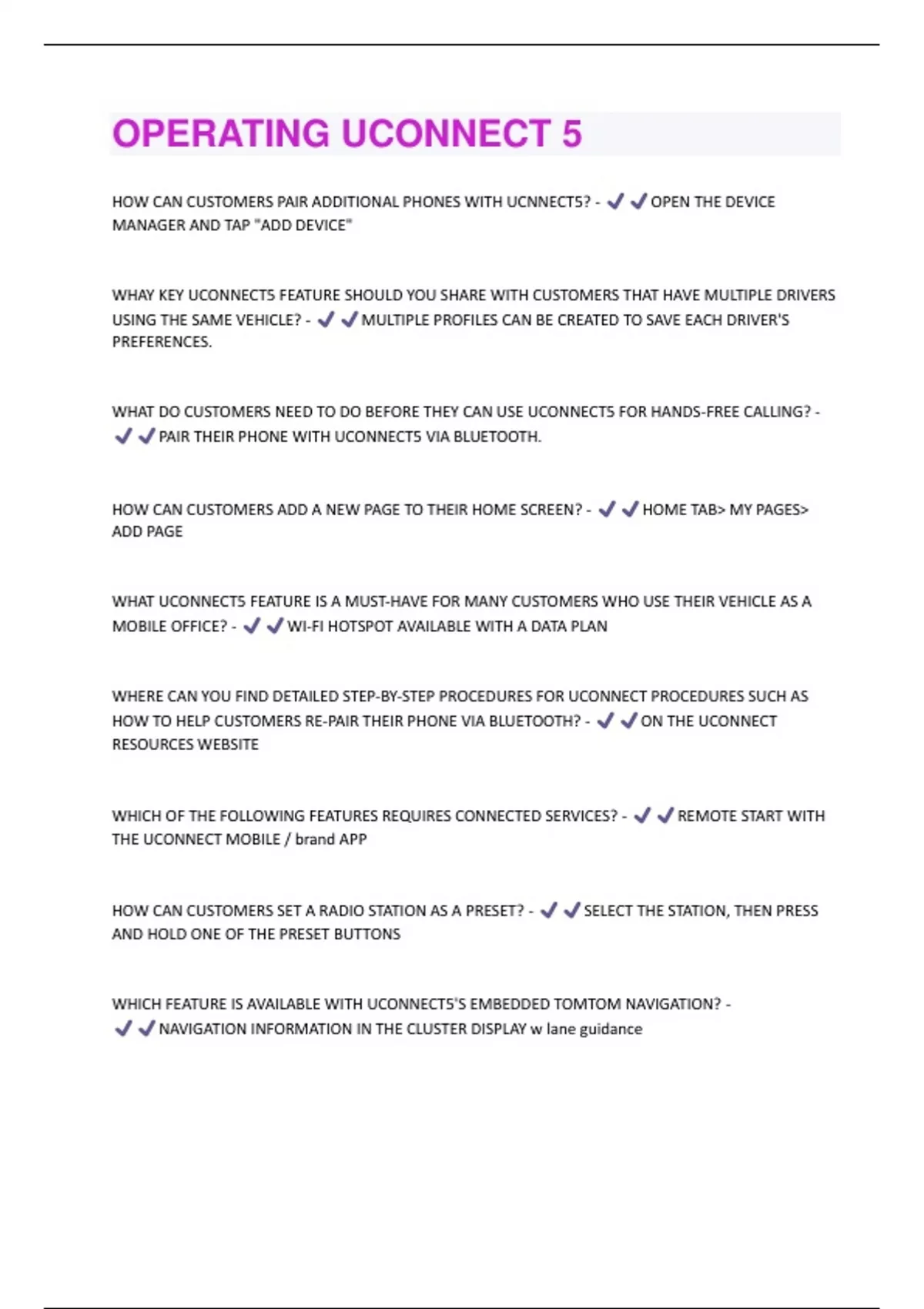 HOW CAN CUSTOMERS PAIR ADDITIONAL PHONES WITH UCNNECT5? - OPEN THE DEVICE MANAGER AND TAP "ADD DEVICE" WHAY KEY UCONNECT5 FEATURE SHOULD YOU SHARE WITH CUSTOMERS THAT HAVE MULTIPLE DRIVERS USING THE SAME VEHICLE? - MULTIPLE PROFILES CAN BE CREATED TO SAVE EACH DRIVER'S PREFERENCES. WHAT DO CUSTOMERS NEED TO DO BEFORE THEY CAN USE UCONNECT5 FOR HANDS-FREE CALLING? - PAIR THEIR PHONE WITH UCONNECT5 VIA BLUETOOTH. HOW CAN CUSTOMERS ADD A NEW PAGE TO THEIR HOME SCREEN? - HOME TAB> MY PAGES> ADD PAGE WHAT UCONNECT5 FEATURE IS A MUST-HAVE FOR MANY CUSTOMERS WHO USE THEIR VEHICLE AS A MOBILE OFFICE? - WI-FI HOTSPOT AVAILABLE WITH A DATA PLAN WHERE CAN YOU FIND DETAILED STEP-BY-STEP PROCEDURES FOR UCONNECT PROCEDURES SUCH AS HOW TO HELP CUSTOMERS RE-PAIR THEIR PHONE VIA BLUETOOTH? - ON THE UCONNECT RESOURCES WEBSITE WHICH OF THE FOLLOWING FEATURES REQUIRES CONNECTED SERVICES? - REMOTE START WITH THE UCONNECT MOBILE / brand APP HOW CAN CUSTOMERS SET A RADIO STATION AS A PRESET? - SELECT THE STATION, THEN PRESS AND HOLD ONE OF THE PRESET BUTTONS WHICH FEATURE IS AVAILABLE WITH UCONNECT5'S EMBEDDED TOMTOM NAVIGATION? - NAVIGATION INFORMATION IN THE CLUSTER DISPLAY w lane guidanceACCORDING TO THIS COURSE, WHAT IS THE EASIEST WAY TO TELL THE DIFFERENCE BETWEEN A UCONNECT5 AND UCONNECT5 NAV SYSTEM? - ONLY UCONNECT5 NAV HAS THE NAVIGATION TAB IN THE BOTTOM MENU BAR Beginning with what model year are users required to activate a connected services subscription in order to enable alexa built-in> - Not- 2021 MY Not- 2020 MY If a vehicle has Uconnect 5 w/out NAV, how can the customer use the voice assistant? - With Apple CarPlay or Android Auto, press and hold the VR button or use the wakeup word What do customers need to do before they can store their phone contact information in Uconnect 5? - Pair their phone with Uconnect 5 via Bluetooth Which of the following features require a Connected Services account? - Remote services, safety and security and vehicle health reports Where can you find the most recent detailed processes for Uconnect? - On the Uconnect resources website How can customers add profiles for multiple drivers? - Profile shortcut (in upper status bar)>add new Which of the following supports audio and video streaming app, as well as games? - Rear seat entertainment with fire tv built in