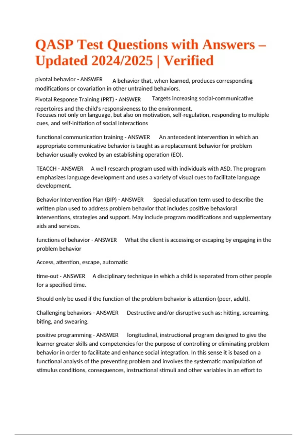 QASP-S Test Questions with Answers – Updated 2024/2025 | Verified. pivotal behavior - ANSWER A behavior that, when learned, produces corresponding modifications or covariation in other untrained behaviors. Pivotal Response Training (PRT) - ANSWER Targets increasing social-communicative repertoires and the child's responsiveness to the environment. Focuses not only on language, but also on motivation, self-regulation, responding to multiple cues, and self-initiation of social interactions functional communication training - ANSWER An antecedent intervention in which an appropriate communicative behavior is taught as a replacement behavior for problem behavior usually evoked by an establishing operation (EO). TEACCH - ANSWER A well research program used with individuals with ASD. The program emphasizes language development and uses a variety of visual cues to facilitate language development. Behavior Intervention Plan (BIP) - ANSWER Special education term used to describe the written plan used to address problem behavior that includes positive behavioral interventions, strategies and support. May include program modifications and supplementary aids and services. functions of behavior - ANSWER What the client is accessing or escaping by engaging in the problem behavior Access, attention, escape, automatic time-out - ANSWER A disciplinary technique in which a child is separated from other people for a specified time. Should only be used if the function of the problem behavior is attention (peer, adult). Challenging behaviors - ANSWER Destructive and/or disruptive such as: hitting, screaming, biting, and swearing. positive programming - ANSWER longitudinal, instructional program designed to give the learner greater skills and competencies for the purpose of controlling or eliminating problem behavior in order to facilitate and enhance social integration. In this sense it is based on a functional analysis of the preventing problem and involves the systematic manipulation of stimulus conditions, consequences, instructional stimuli and other variables in an effort to QASP Test Questions with Answers – Updated 2024/2025 | Verified establish the new, more adaptive behavioral repertoire. positive behavior support plan - ANSWER Typical plans involve an objective for the intervention, prevention strategies, replacement behaviors, reinforcers, attention to what should not be reinforced, and ways to monitor children's progress delivering consequences - ANSWER immediacy operational definition - ANSWER a statement of the procedures used to define research variables. The procedures included in definitions should be repeatable by anyone or at least by peers. onset and offset behavior - ANSWER Behavior must have a defined beginning and end added to the definition. Doing so increases the strength of your intervention by increasing the likelihood of accurate measurement frequency/rate - ANSWER Ratio of count per observation time baseline data - ANSWER information gathered by scientists to be used as a starting point to compare changes after the implementation of the independent variable topography - ANSWER what a behavior looks like generallization - ANSWER intervention can only be deemed a success if change can be shown in different environments and with multiple people evidence based - ANSWER description of medical techniques or practices that are supported by scientific evidence of their safety and efficacy, rather than merely on supposition and tradition. advocacy - ANSWER Quality advocacy services are person-centered and developed using a co-production approach that aims to maximize the participation of people who use services and their carers person centered planning - ANSWER a method of planning for people with disabilities that places the person and his family at the center of the planning process seeks to build a support network, increase independence and connect to the community Circle of support - ANSWER meeting of extended family, friends, service providers, etc. to ensure well-being of a child about to age out of cps care essential lifestyle plans - ANSWER ELP is a guided process for learning how someone wants to live and for developing a plan to help make it happen. It's also: A snapshot of how someone wants to live today, serving as a blueprint for how to support someone tomorrow; A way of organizing and communicating what is important to an individual; A flexible process that can be used in combination with other person centered techniques; A way of making sure that the person is heard, regardless of the severity of disability. QASP will demonstrate - ANSWER trustworthiness, honesty, fairness and sincerity Autism Spectrum Disorder (ASD) - ANSWER A disorder characterized by deficits in social relatedness and communication skills that are often accompanied by repetitive, ritualistic behavior. ASD deficits - ANSWER Social interaction, communication, repetitive/restricitive beahviors Triad of Impairments - ANSWER Deficits in reciprocal social interaction Deficits in communication Restricted, repetitive behaviors, interests or activities. joint attention - ANSWER Joint Attention and Social Referencing. Joint attention occurs when two people share interest in an object or event and there is understanding between the two people that they are both interested in the same object or event.Less likely to use gestures or eye contact as a means of sharing interest and directing interactional partners' attention to object of interest •Instrumental use less likely to be impaired Autism (word) History - ANSWER The word "autism" comes from the Greek word "autos," which means "self." It describes conditions in which a person is removed from social interaction. In other words, he becomes an "isolated self." IDEA- First recognized ASD - ANSWER 1990 Least Restrictive Environment (LRE) - ANSWER when the Individualized Education Program (IEP) is written, a determination is made regarding the amount of time each