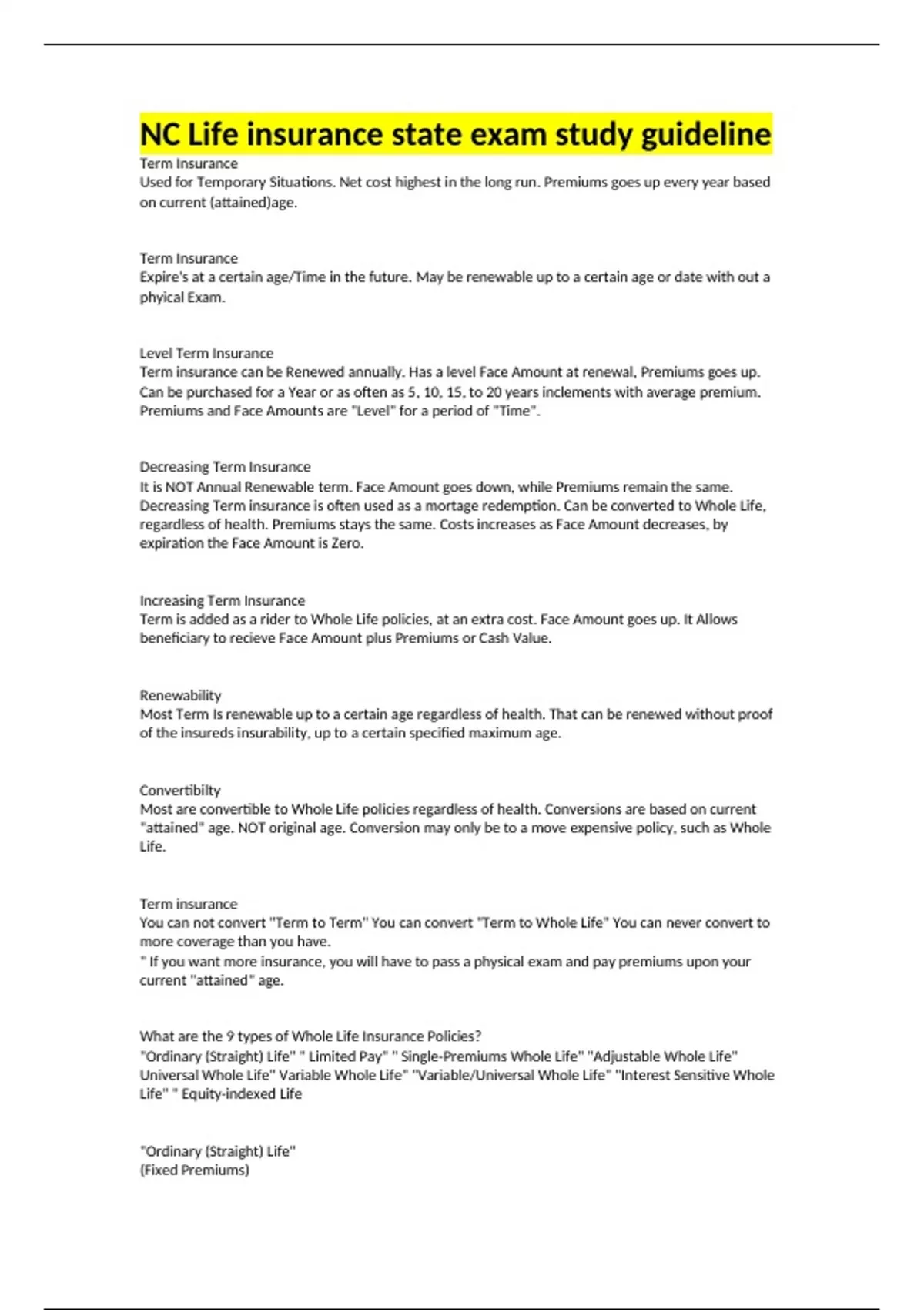 NC Life insurance state exam study guideline Term Insurance Used for Temporary Situations. Net cost highest in the long run. Premiums goes up every year based on current (attained)age. Term Insurance Expire's at a certain age/Time in the future. May be renewable up to a certain age or date with out a phyical Exam. Level Term Insurance Term insurance can be Renewed annually. Has a level Face Amount at renewal, Premiums goes up. Can be purchased for a Year or as often as 5, 10, 15, to 20 years inclements with average premium. Premiums and Face Amounts are "Level" for a period of "Time". Decreasing Term Insurance It is NOT Annual Renewable term. Face Amount goes down, while Premiums remain the same. Decreasing Term insurance is often used as a mortage redemption. Can be converted to Whole Life, regardless of health. Premiums stays the same. Costs increases as Face Amount decreases, by expiration the Face Amount is Zero. Increasing Term Insurance Term is added as a rider to Whole Life policies, at an extra cost. Face Amount goes up. It Allows beneficiary to recieve Face Amount plus Premiums or Cash Value. Renewability Most Term Is renewable up to a certain age regardless of health. That can be renewed without proof of the insureds insurability, up to a certain specified maximum age. Convertibilty Most are convertible to Whole Life policies regardless of health. Conversions are based on current "attained" age. NOT original age. Conversion may only be to a move expensive policy, such as Whole Life. Term insurance You can not convert "Term to Term" You can convert "Term to Whole Life" You can never convert to more coverage than you have. " If you want more insurance, you will have to pass a physical exam and pay premiums upon your current "attained" age. What are the 9 types of Whole Life Insurance Policies? "Ordinary (Straight) Life" " Limited Pay" " Single-Premiums Whole Life" "Adjustable Whole Life" Universal Whole Life" Variable Whole Life" "Variable/Universal Whole Life" "Interest Sensitive Whole Life" " Equity-indexed Life "Ordinary (Straight) Life" (Fixed Premiums) Permanent protection (matures at age 100) Guaranteed Tax deferred Interest rate on Cash Value. Cash Value builds slowly for the first 3 years. Premiums are level, since the company risks goes down as Cash Value goes up. If you die the insurer keeps the Cash Value to offset their risks. Insureds has access to Cash through Cash Surrender or a policy loan. "Rates are per unit of protection" ($1,000 is 1 unit) C/V is guaranteed to be a certain amount per $1,000 (in the future). C/V will equal F/A at policy maturity (age 100). Limited Pay and Single premium Whole Life (Fixed Premiums) Limited Pay can also be as LP65 or 20pay life 30 paylife, so don't get these confussed, they are the same thing. Premium paying period is shorter. Still matures at age 100 (Not end of premium paying period) Client pays same amount of money over a shorter period of time. The shorter the premium paying period, the higher the premium. C/v builds faster than Oridary WL. A single-premium policy will have an Immediate C/V. Limited-pay Whole Life A 20 paylife will be paid up in 20 years If purchased at age 30, paid up at age 50. The premium is paid up, your still covered till the policy matures at age 100. A life paid up at age 65, will be paid up at age 65 (LP65) If purchased at age 30, paid up at age 65. The premium is paid up at age 65, your still covered until policy matures at age 100. Adjustable Whole life ( Flexible Premium) Is a combination of Term and Whole Life! Still cover you until you die or age 100 (matures) Insureds can adjust Face Amount, Premiums or Term of Protection. Sold to Clients with Fluctuating income ( real estate brokers) Coverage may not be increased beyond the original amount without an physical. Universal Whole Life (Flexible Premiums) Guaranteed "Minimum" Interest Rate. Current interest rate which varies year to year. Has Extreme Flexibilty regarding premiums payments. Insured does not have to pay annual premium ( Cash Value may be debited to pay cost of protection) "THIS WOULD NOT BE A LOAN" Protection portion of policy is actually term insurance ( cost increases) Target Premium based on projected earnings. Option A: Universal Life has a level death benefit (term) Face Amount is made of term insurance Option B: Universal Life will pay beneficiary both Face Amount PLUS Cash Value. Variable Whole Life (Fixed Premiums) Cash Value deposited into a "Separate Account" (Like a mutual Fund) NO guaranteed rate of return or Cash Value. It does have a "Minimum death beneft (Face Amount) is guaranteed. Projections may be used as long as they are not guaranteed. Requires FINRA Series 6 or 7 license to sell! FINRA ( Financial industry Regulatory Authority) Variable/ Universal Whole Life (Flexible Premium) Combines best features of both Universal and Variable whole life. Requires a FINRA series 6 or 7 securities license to sell. Clients can self direct cash values into sub-accounts. No guaranteed Interest Rate or Cash Value. Face Amount is term insurance (option A) Policy may pay out mopre upon death if (option B) is selected, Face Amount plus Cash Value Interest Sensitive Whole Life (Flexible Premium) General just another name for UNIVERSAL LIFE (UL) Current Interest rate that varies year to year Has Guaranteed "Minimum" Interest Rate A combination of Term and Interest bearing savings account. Equity-Indexed Life (Fixed Premium) A type of Cash Value Life insurance, where the Minimum death benefit is Guaranteed, as well as the Minimum earning on the Cash Value in the General Account. Not classified as securities, Securities license is NOT required. Cash Value accumulation is usually linked to an Index S&P 500. Index outperforms the guaranteed interest rate, the difference is credited to the Cash Value as per the insurance contract. Which Whole life Insurance policies have a level or Flexible premium? ordinary whole life Limited-pay whole life