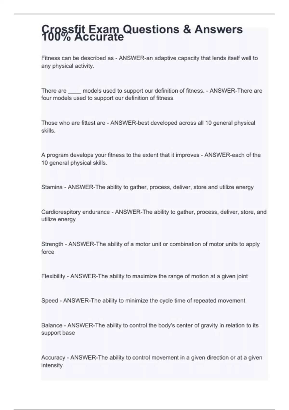Fitness can be described as - ANSWER-an adaptive capacity that lends itself well to any physical activity. There are ____ models used to support our definition of fitness. - ANSWER-There are four models used to support our definition of fitness. Those who are fittest are - ANSWER-best developed across all 10 general physical skills. A program develops your fitness to the extent that it improves - ANSWER-each of the 10 general physical skills. Stamina - ANSWER-The ability to gather, process, deliver, store and utilize energy Cardiorespitory endurance - ANSWER-The ability to gather, process, deliver, store, and utilize energy Strength - ANSWER-The ability of a motor unit or combination of motor units to apply force Flexibility - ANSWER-The ability to maximize the range of motion at a given joint Speed - ANSWER-The ability to minimize the cycle time of repeated movement Balance - ANSWER-The ability to control the body's center of gravity in relation to its support base