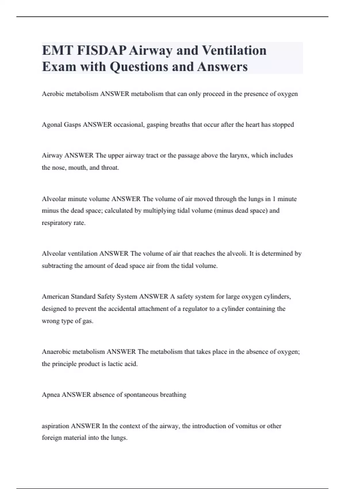 EMT FISDAP Airway and Ventilation Exam with Questions and Answers Aerobic metabolism ANSWER metabolism that can only proceed in the presence of oxygen Agonal Gasps ANSWER occasional, gasping breaths that occur after the heart has stopped Airway ANSWER The upper airway tract or the passage above the larynx, which includes the nose, mouth, and throat. Alveolar minute volume ANSWER The volume of air moved through the lungs in 1 minute minus the dead space; calculated by multiplying tidal volume (minus dead space) and respiratory rate. Alveolar ventilation ANSWER The volume of air that reaches the alveoli. It is determined by subtracting the amount of dead space air from the tidal volume. American Standard Safety System ANSWER A safety system for large oxygen cylinders, designed to prevent the accidental attachment of a regulator to a cylinder containing the wrong type of gas. Anaerobic metabolism ANSWER The metabolism that takes place in the absence of oxygen; the principle product is lactic acid. Apnea ANSWER absence of spontaneous breathing aspiration ANSWER In the context of the airway, the introduction of vomitus or other foreign material into the lungs.