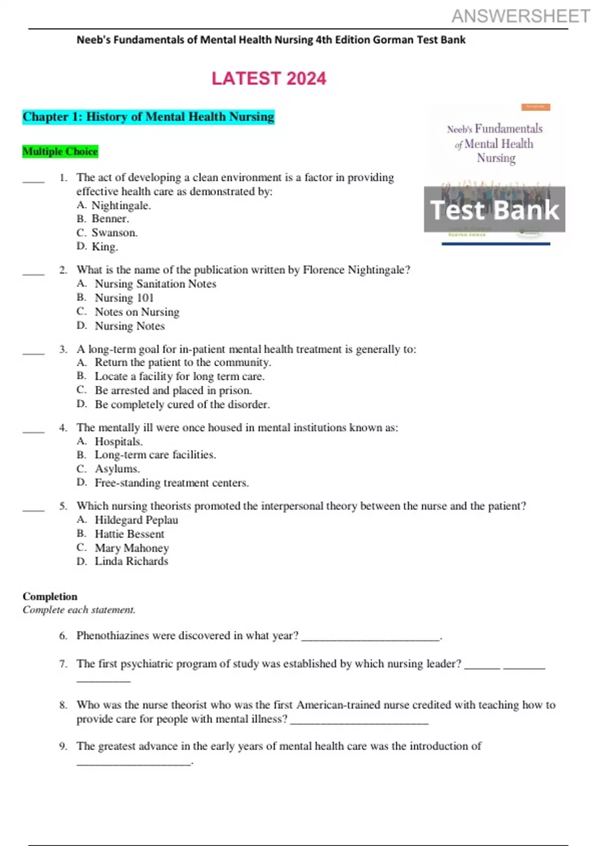 nee fundamentals of mental health nursing TESTbank||Latest 2024||verified by experts||ANSWERSHEET
