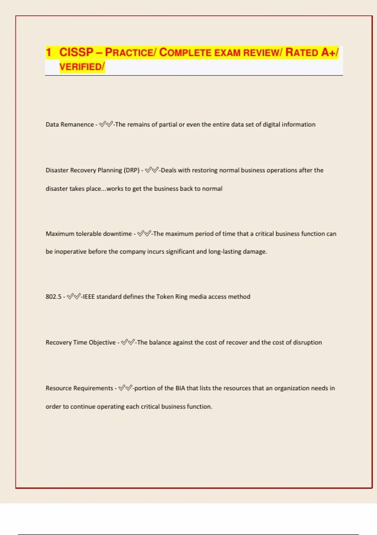 CISSP – PRACTICE/ COMPLETE EXAM REVIEW/ RATED A+/ VERIFIED/ Data Remanence - -The remains of partial or even the entire data set of digital information Disaster Recovery Planning (DRP) - -Deals with restoring normal business operations after the disaster takes place...works to get the business back to normal Maximum tolerable downtime - -The maximum period of time that a critical business function can be inoperative before the company incurs significant and long-lasting damage. 802.5 - -IEEE standard defines the Token Ring media access method Recovery Time Objective - -The balance against the cost of recover and the cost of disruption Resource Requirements - -portion of the BIA that lists the resources that an organization needs in order to continue operating each critical business function. Checklist - -Test is one in which copies of the plan are handed out to each functional area to ensure the plan deal with their needs Information Owner - -The one person responsible for data, its classification and control setting Job Rotation - -To move from location to location, keeping the same function Differential power analysis - -A side-channel attack carry-out on smart cards that examining the power emission release during processing Mitigate - -Defined as real-time monitoring and analysis of network activity and data for potential vulnerabilities and attacks in progress. Electromagnetic analysis - -A side-channel attack on smart cards that examine the frequencies emitted and timin