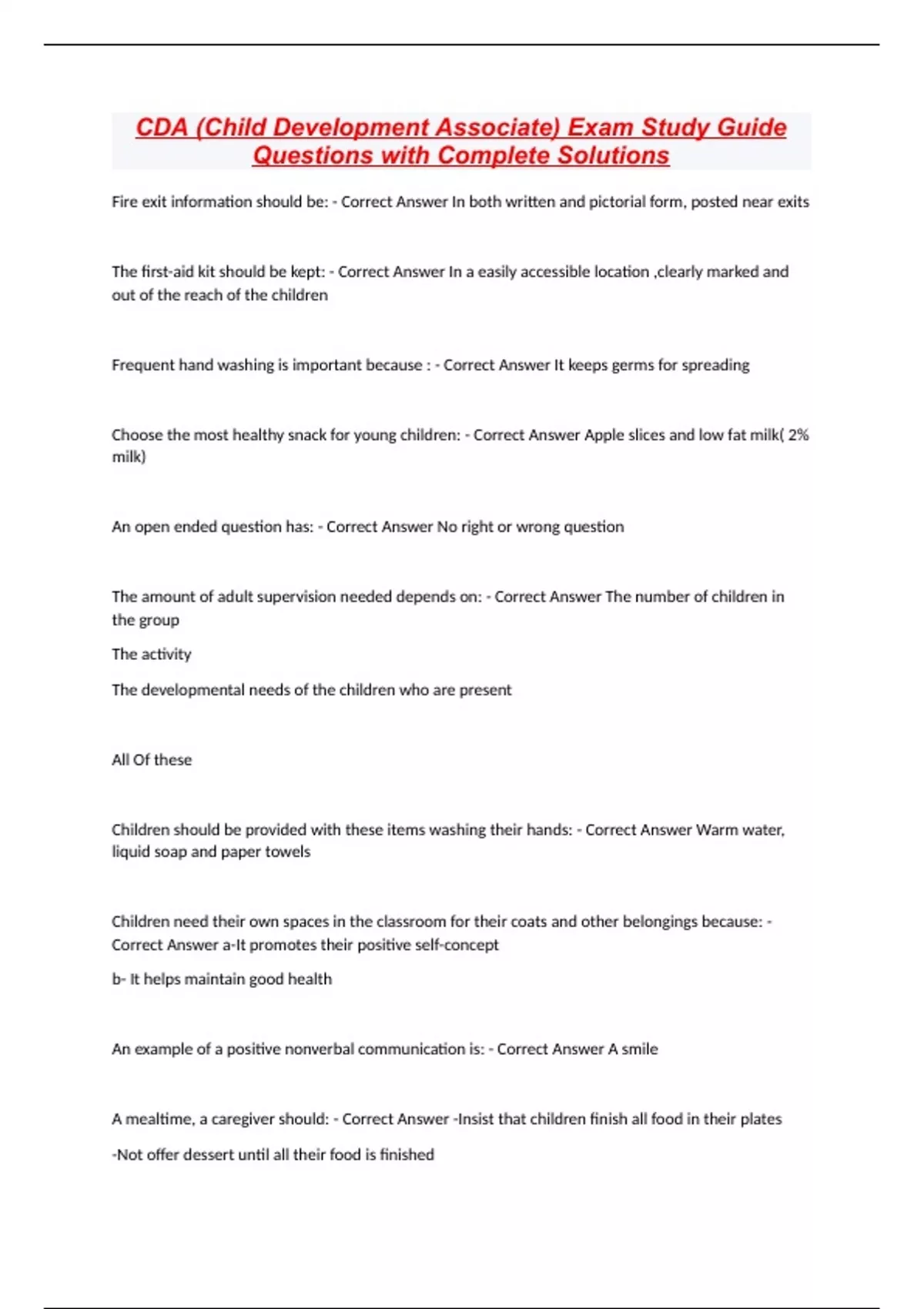 CDA (Child Development Associate) Exam Study Guide Questions with Complete Solutions Fire exit information should be: - Correct Answer In both written and pictorial form, posted near exits The first-aid kit should be kept: - Correct Answer In a easily accessible location ,clearly marked and out of the reach of the children Frequent hand washing is important because : - Correct Answer It keeps germs for spreading Choose the most healthy snack for young children: - Correct Answer Apple slices and low fat milk( 2% milk) An open ended question has: - Correct Answer No right or wrong question The amount of adult supervision needed depends on: - Correct Answer The number of children in the group The activity The developmental needs of the children who are present All Of these Children should be provided with these items washing their hands: - Correct Answer Warm water, liquid soap and paper towels Children need their own spaces in the classroom for their coats and other belongings because: - Correct Answer a-It promotes their positive self-concept b- It helps maintain good health An example of a positive nonverbal communication is: - Correct Answer A smile A mealtime, a caregiver should: - Correct Answer -Insist that children finish all food in their plates -Not offer dessert until all their food is finished
