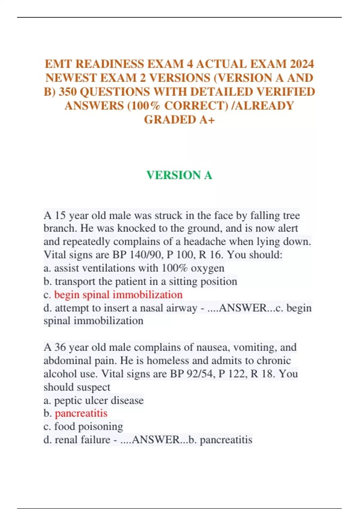EMT READINESS EXAM 4 ACTUAL EXAM 2024 NEWEST EXAM 2 VERSIONS (VERSION A AND B) 350 QUESTIONS WITH DETAILED VERIFIED ANSWERS (100% CORRECT) /ALREADY GRADED A+