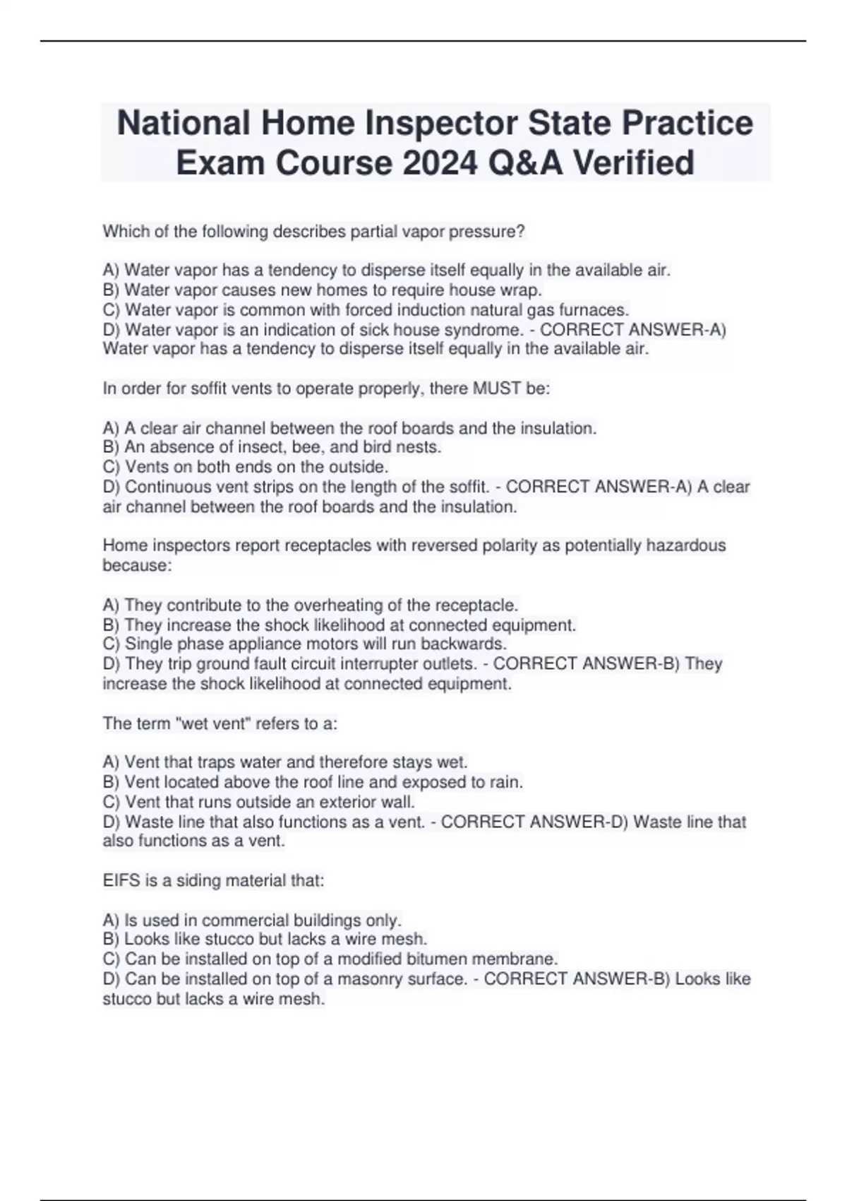 National Home Inspector State Practice Exam Course 2024 Q&A Verified Which of the following describes partial vapor pressure? A) Water vapor has a tendency to disperse itself equally in the available air. B) Water vapor causes new homes to require house wrap. C) Water vapor is common with forced induction natural gas furnaces. D) Water vapor is an indication of sick house syndrome. - CORRECT ANSWER-A) Water vapor has a tendency to disperse itself equally in the available air. In order for soffit vents to operate properly, there MUST be: A) A clear air channel between the roof boards and the insulation. B) An absence of insect, bee, and bird nests. C) Vents on both ends on the outside. D) Continuous vent strips on the length of the soffit. - CORRECT ANSWER-A) A clear air channel between the roof boards and the insulation. Home inspectors report receptacles with reversed polarity as potentially hazardous because: A) They contribute to the overheating of the receptacle. B) They increase the shock likelihood at connected equipment. C) Single phase appliance motors will run backwards. D) They trip ground fault circuit interrupter outlets. - CORRECT ANSWER-B) They increase the shock likelihood at connected equipment. The term "wet vent" refers to a: A) Vent that traps water and therefore stays wet. B) Vent located above the roof line and exposed to rain. C) Vent that runs outside an exterior wall. D) Waste line that also functions as a vent. - CORRECT ANSWER-D) Waste line that also functions as a vent. EIFS is a siding material that: A) Is used in commercial buildings only. B) Looks like stucco but lacks a wire mesh. C) Can be installed on top of a modified bitumen membrane. D) Can be installed on top of a masonry surface. - CORRECT ANSWER-B) Looks like stucco but lacks a wire mesh.