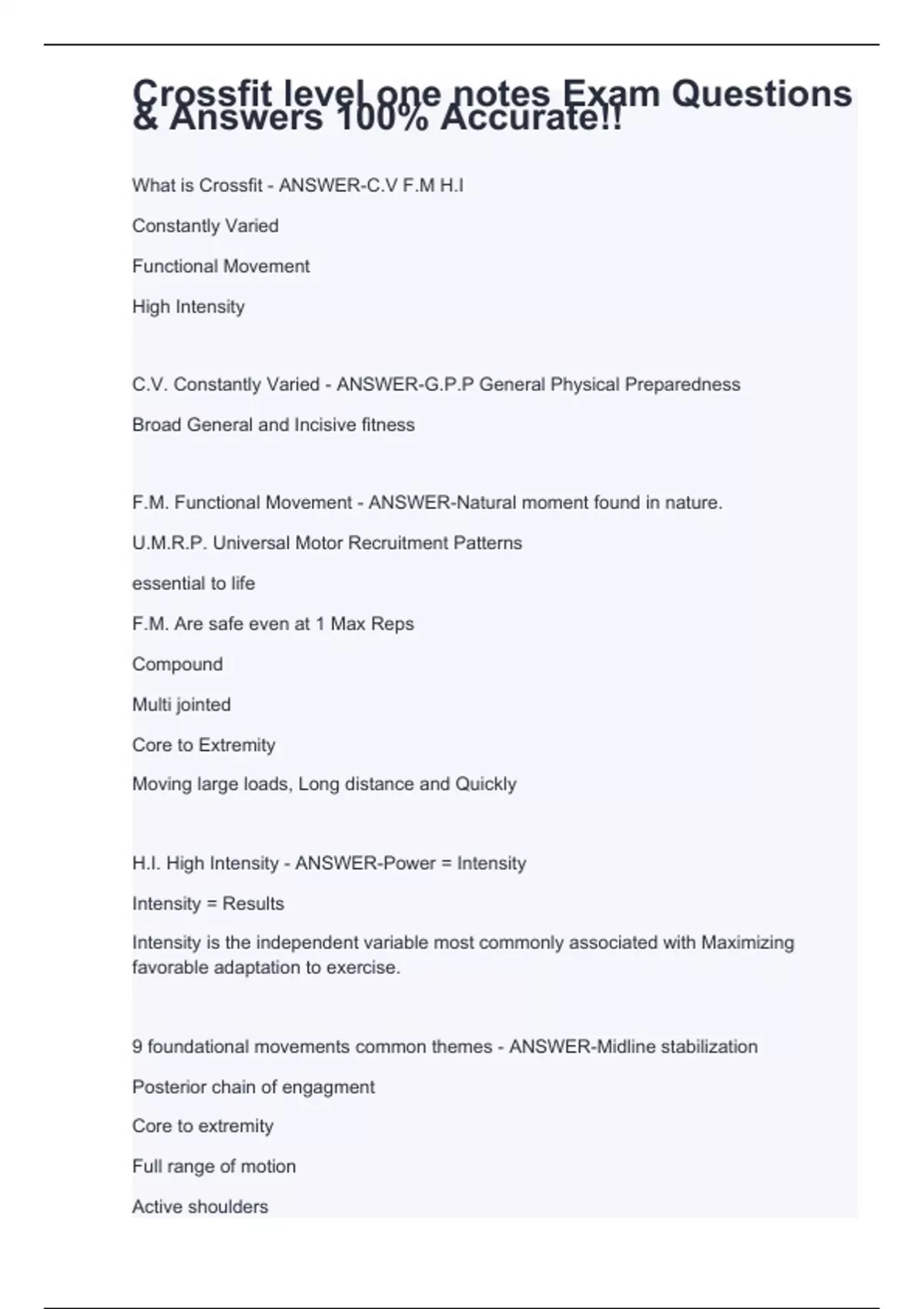 What is Crossfit - ANSWER-C.V F.M H.I Constantly Varied Functional Movement High Intensity C.V. Constantly Varied - ANSWER-G.P.P General Physical Preparedness Broad General and Incisive fitness F.M. Functional Movement - ANSWER-Natural moment found in nature. U.M.R.P. Universal Motor Recruitment Patterns essential to life F.M. Are safe even at 1 Max Reps Compound Multi jointed Core to Extremity Moving large loads, Long distance and Quickly H.I. High Intensity - ANSWER-Power = Intensity Intensity = Results Intensity is the independent variable most commonly associated with Maximizing favorable adaptation to exercise. 9 foundational movements common themes - ANSWER-Midline stabilization Posterior chain of engagment Core to extremity