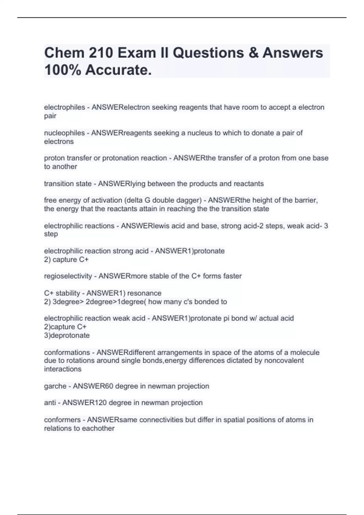 electrophiles - ANSWERelectron seeking reagents that have room to accept a electron pair nucleophiles - ANSWERreagents seeking a nucleus to which to donate a pair of electrons proton transfer or protonation reaction - ANSWERthe transfer of a proton from one base to another transition state - ANSWERlying between the products and reactants free energy of activation (delta G double dagger) - ANSWERthe height of the barrier, the energy that the reactants attain in reaching the the transition state electrophilic reactions - ANSWERlewis acid and base, strong acid-2 steps, weak acid- 3 step electrophilic reaction strong acid - ANSWER1)protonate 2) capture C+ regioselectivity - ANSWERmore stable of the C+ forms faster C+ stability - ANSWER1) resonance 2) 3degree> 2degree>1degree( how many c's bonded to electrophilic reaction weak acid - ANSWER1)protonate pi bond w/ actual acid 2)capture C+ 3)deprotonate conformations - ANSWERdifferent arrangements in space of the atoms of a molecule due to rotations around single bonds,energy differences dictated by noncovalent interactions