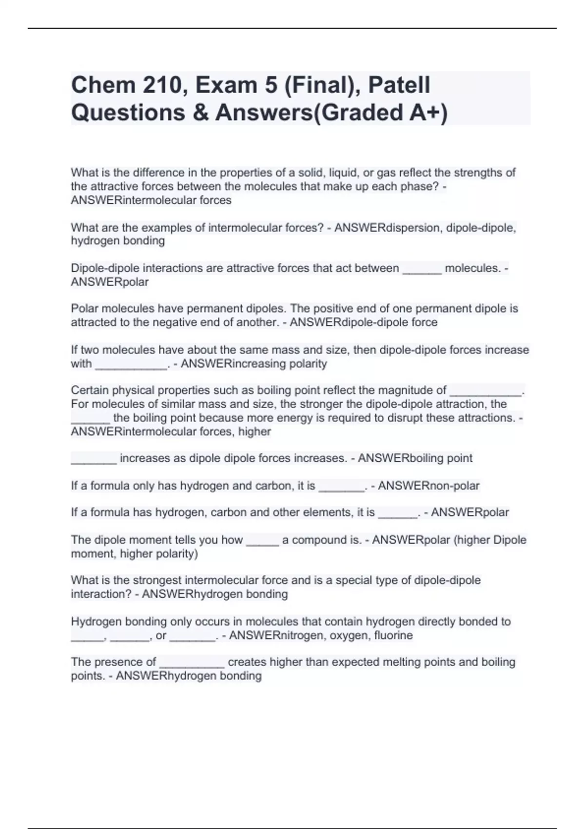 Chem 210, Exam 5 (Final), Patell Questions & Answers(Graded A+)