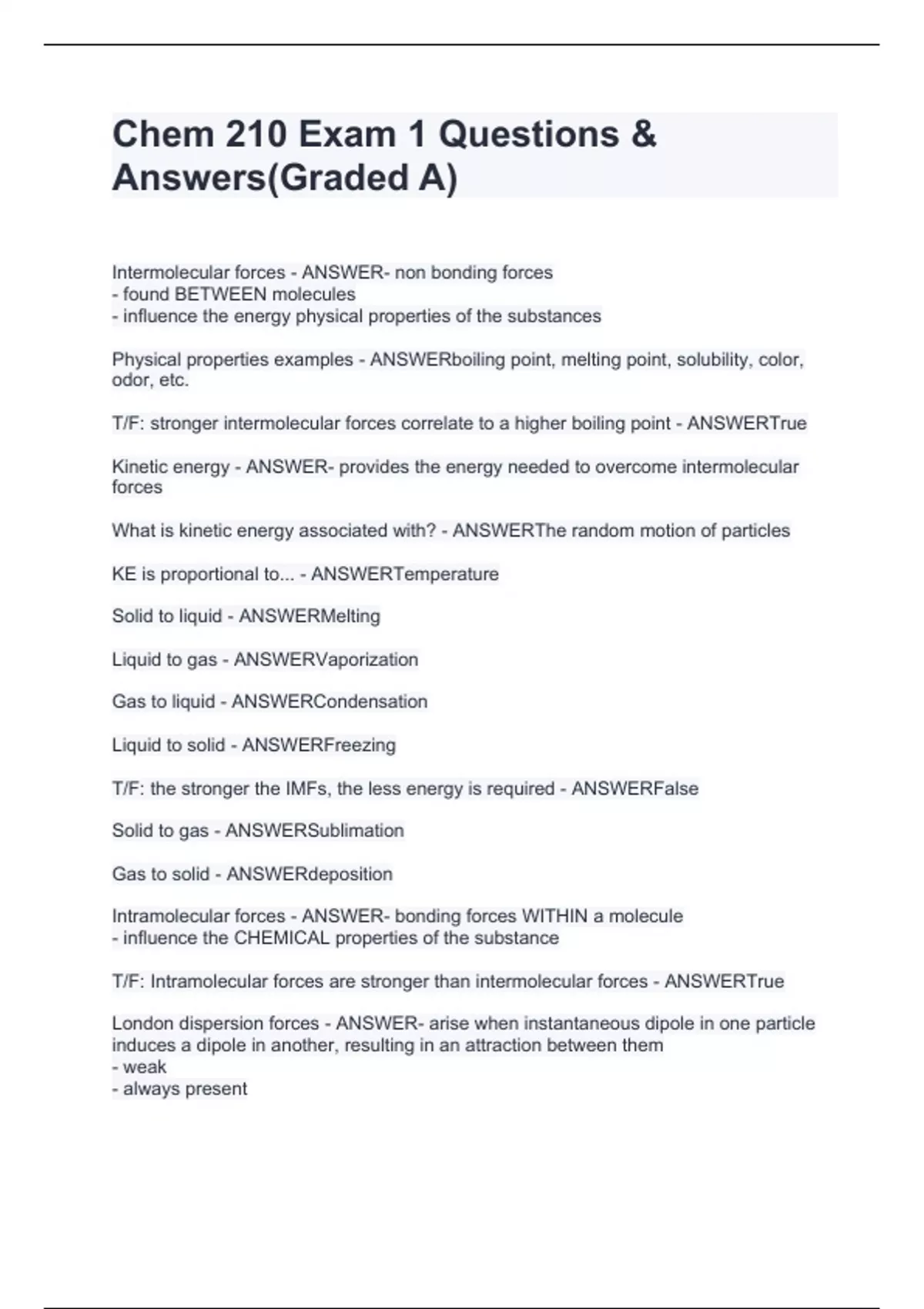 Intermolecular forces - ANSWER- non bonding forces - found BETWEEN molecules - influence the energy physical properties of the substances Physical properties examples - ANSWERboiling point, melting point, solubility, color, odor, etc. T/F: stronger intermolecular forces correlate to a higher boiling point - ANSWERTrue Kinetic energy - ANSWER- provides the energy needed to overcome intermolecular forces What is kinetic energy associated with? - ANSWERThe random motion of particles KE is proportional to... - ANSWERTemperature Solid to liquid - ANSWERMelting Liquid to gas - ANSWERVaporization Gas to liquid - ANSWERCondensation Liquid to solid - ANSWERFreezing T/F: the stronger the IMFs, the less energy is required - ANSWERFalse Solid to gas - ANSWERSublimation Gas to solid - ANSWERdeposition Intramolecular forces - ANSWER- bonding forces WITHIN a molecule - influence the CHEMICAL properties of the substance T/F: Intramolecular forces are stronger than intermolecular forces - ANSWERTrue London dispersion forces - ANSWER- arise when instantaneous dipole in one particle induces a dipole in another, resulting in an attraction between them - weak - always present Dipole - ANSWERUneven distribution of electrons within a molecule LDF trends - ANSWER- Larger atoms/particles (more electrons) experience stronger dispersion forces - larger electron cloud can be more easily distorted T/F: molecular shape has no effect on dispersion forces - ANSWERFalse Surface area and LDF's - ANSWERMolecule with larger surface area has stronger