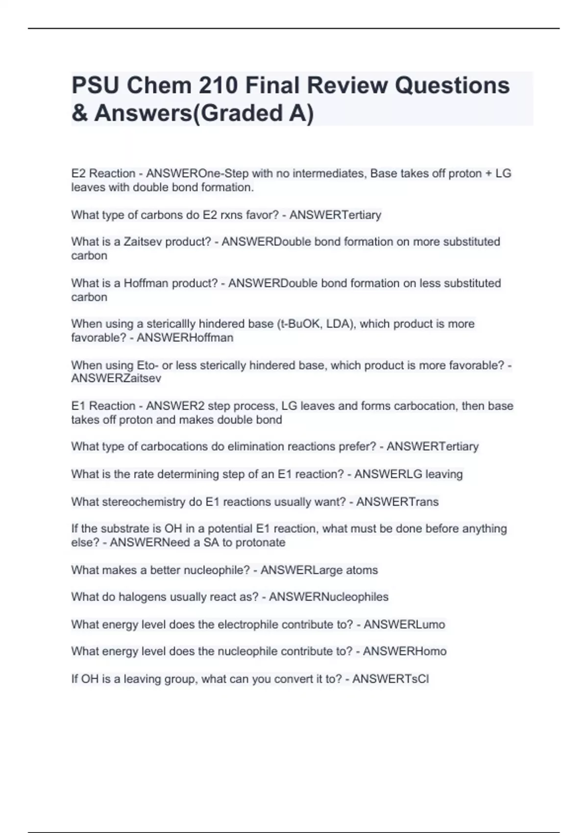 PSU Chem 210 Final Review Questions & Answers(Graded A)