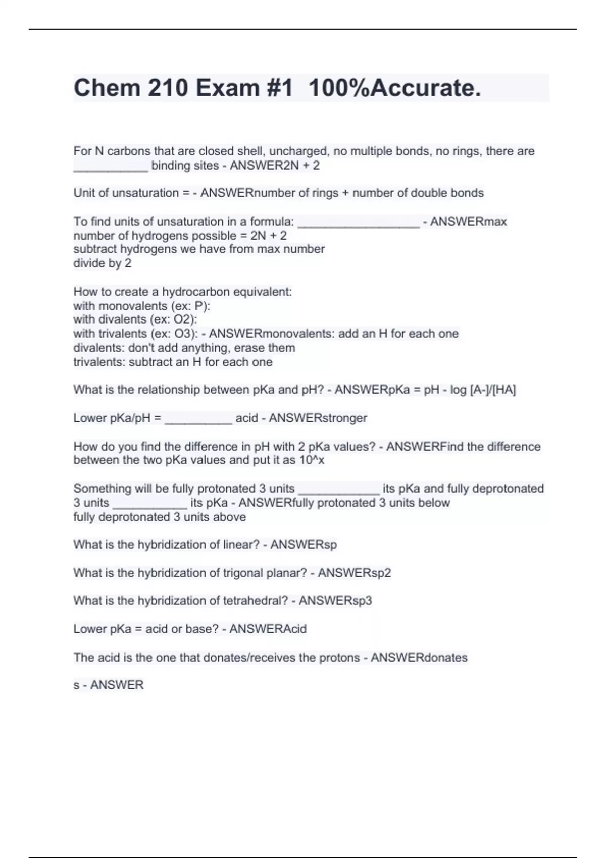 For N carbons that are closed shell, uncharged, no multiple bonds, no rings, there are ___________ binding sites - ANSWER2N + 2 Unit of unsaturation = - ANSWERnumber of rings + number of double bonds To find units of unsaturation in a formula: __________________ - ANSWERmax number of hydrogens possible = 2N + 2 subtract hydrogens we have from max number divide by 2 How to create a hydrocarbon equivalent: with monovalents (ex: P): with divalents (ex: O2): with trivalents (ex: O3): - ANSWERmonovalents: add an H for each one divalents: don't add anything, erase them trivalents: subtract an H for each one What is the relationship between pKa and pH? - ANSWERpKa = pH - log [A-]/[HA] Lower pKa/pH = __________ acid - ANSWERstronger How do you find the difference in pH with 2 pKa values? - ANSWERFind the difference between the two pKa values and put it as 10^x Something will be fully protonated 3 units ____________ its pKa and fully deprotonated 3 units ___________ its pKa - ANSWERfully protonated 3 units below fully deprotonated 3 units above What is the hybridization of linear? - ANSWERsp What is the hybridization of trigonal planar? - ANSWERsp2 What is the hybridization of tetrahedral? - ANSWERsp3 Lower pKa = acid or base? - ANSWERAcid The acid is the one that donates/receives the protons - ANSWERdonates s