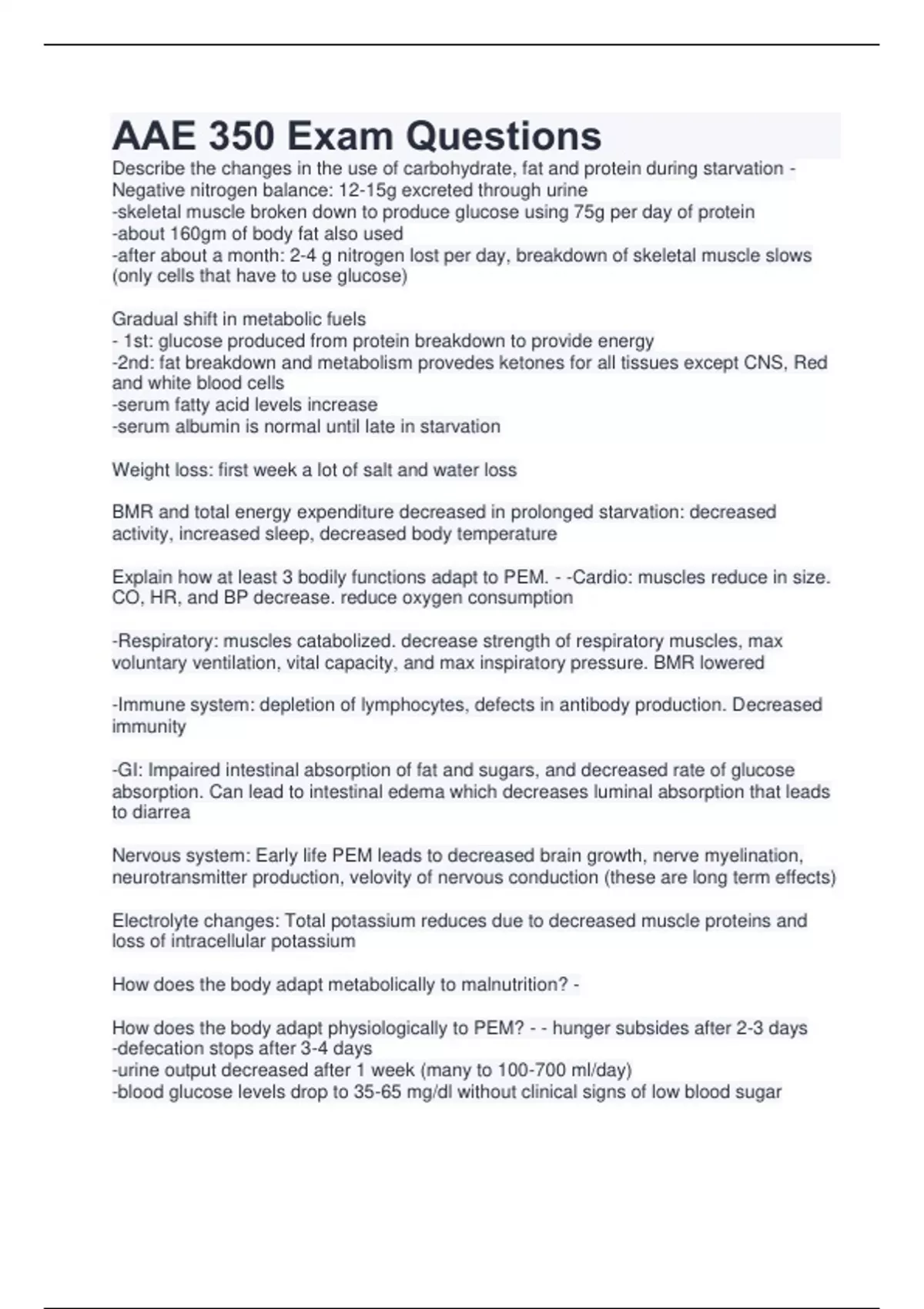 Describe the changes in the use of carbohydrate, fat and protein during starvation - Negative nitrogen balance: 12-15g excreted through urine -skeletal muscle broken down to produce glucose using 75g per day of protein -about 160gm of body fat also used -after about a month: 2-4 g nitrogen lost per day, breakdown of skeletal muscle slows (only cells that have to use glucose) Gradual shift in metabolic fuels - 1st: glucose produced from protein breakdown to provide energy -2nd: fat breakdown and metabolism provedes ketones for all tissues except CNS, Red and white blood cells -serum fatty acid levels increase -serum albumin is normal until late in starvation Weight loss: first week a lot of salt and water loss BMR and total energy expenditure decreased in prolonged starvation: decreased activity, increased sleep, decreased body temperature Explain how at least 3 bodily functions adapt to PEM. - -Cardio: muscles reduce in size. CO, HR, and BP decrease. reduce oxygen consumption -Respiratory: muscles catabolized. decrease strength of respiratory muscles, max voluntary ventilation, vital capacity, and max inspiratory pressure. BMR lowered -Immune system: depletion of lymphocytes, defects in antibody production. Decreased immunity -GI: Impaired intestinal absorption of fat and sugars, and decreased rate of glucose absorption. Can lead to intestinal edema which decreases luminal absorption that leads to diarrea Nervous system: Early life PEM leads to decreased brain growth, nerve myelination, neurotransmitter production, velovity of nervous conduction (these are long term effects) Electrolyte changes: Total potassium reduces due to decreased muscle proteins and loss of intracellular potassium How does the body adapt metabolically to malnutrition? - How does the body adapt physiologically to PEM? - - hunger subsides after 2-3 days -defecation stops after 3-4 days -urine output decreased after 1 week (many to 100-700 ml/day) -blood glucose levels drop to 35-65 mg/dl without clinical signs of low blood sugar