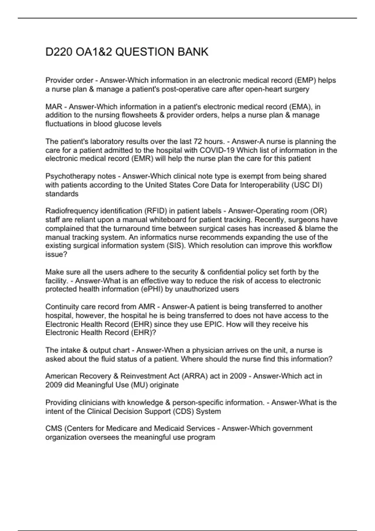 Provider order - Answer-Which information in an electronic medical record (EMP) helps a nurse plan & manage a patient's post-operative care after open-heart surgery MAR - Answer-Which information in a patient's electronic medical record (EMA), in addition to the nursing flowsheets & provider orders, helps a nurse plan & manage fluctuations in blood glucose levels The patient's laboratory results over the last 72 hours. - Answer-A nurse is planning the care for a patient admitted to the hospital with COVID-19 Which list of information in the electronic medical record (EMR) will help the nurse plan the care for this patient Psychotherapy notes - Answer-Which clinical note type is exempt from being shared with patients according to the United States Core Data for Interoperability (USC DI) standards Radiofrequency identification (RFID) in patient labels - Answer-Operating room (OR) staff are reliant upon a manual whiteboard for patient tracking. Recently, surgeons have complained that the turnaround time between surgical cases has increased & blame the manual tracking system. An informatics nurse recommends expanding the use of the existing surgical information system (SIS). Which resolution can improve this workflow issue? Make sure all the users adhere to the security & confidential policy set forth by the facility. - Answer-What is an effective way to reduce the risk of access to electronic protected health information (ePHI) by unauthorized users Continuity care record from AMR - Answer-A patient is being transferred to another hospital, however, the hospital he is being transferred to does not have access to the Electronic Health Record (EHR) since they use EPIC. How will they receive his Electronic Health Record (EHR)? The intake & output chart - Answer-When a physician arrives on the unit, a nurse is asked about the fluid status of a patient. Where should the nurse find this information? American Recovery & Reinvestment Act (ARRA) act in 2009 - Answer-Which act in 2009 did Meaningful Use (MU) originate Providing clinicians with knowledge & person-specific information. - Answer-What is the intent of the Clinical Decision Support (CDS) System CMS (C