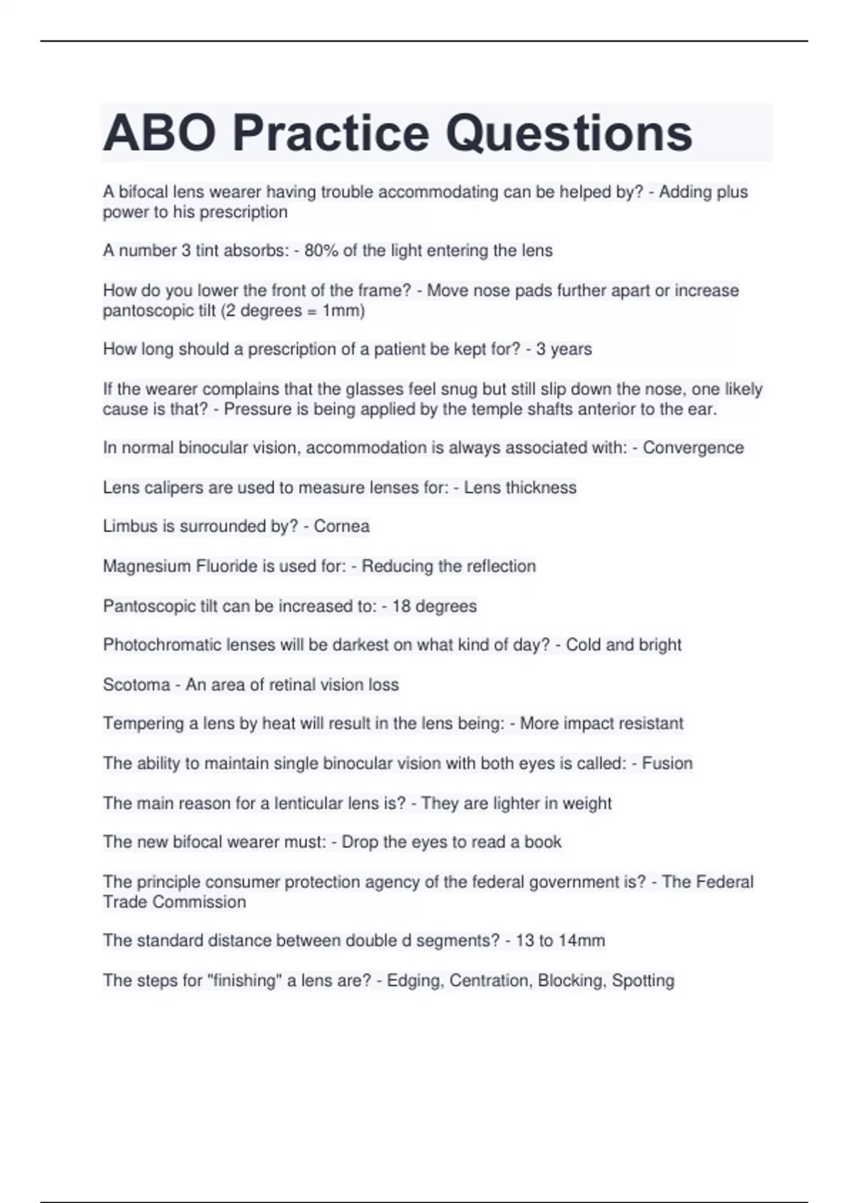 A bifocal lens wearer having trouble accommodating can be helped by? - Adding plus power to his prescription A number 3 tint absorbs: - 80% of the light entering the lens How do you lower the front of the frame? - Move nose pads further apart or increase pantoscopic tilt (2 degrees = 1mm) How long should a prescription of a patient be kept for? - 3 years If the wearer complains that the glasses feel snug but still slip down the nose, one likely cause is that? - Pressure is being applied by the temple shafts anterior to the ear. In normal binocular vision, accommodation is always associated with: - Convergence Lens calipers are used to measure lenses for: - Lens thickness Limbus is surrounded by? - Cornea Magnesium Fluoride is used for: - Reducing the reflection Pantoscopic tilt can be increased to: - 18 degrees Photochromatic lenses will be darkest on what kind of day? - Cold and bright Scotoma - An area of retinal vision loss Tempering a lens by heat will result in the lens being: - More impact resistant The ability to maintain single binocular vision with both eyes is called: - Fusion The main reason for a lenticular lens is? - They are lighter in weight The new bifocal wearer must: - Drop the eyes to read a book The principle consumer protection agency of the federal government is? - The Federal Trade Commission The standard distance between double d segments? - 13 to 14mm The steps for "finishing" a lens are? - Edging, Centration, Blocking, Spotting