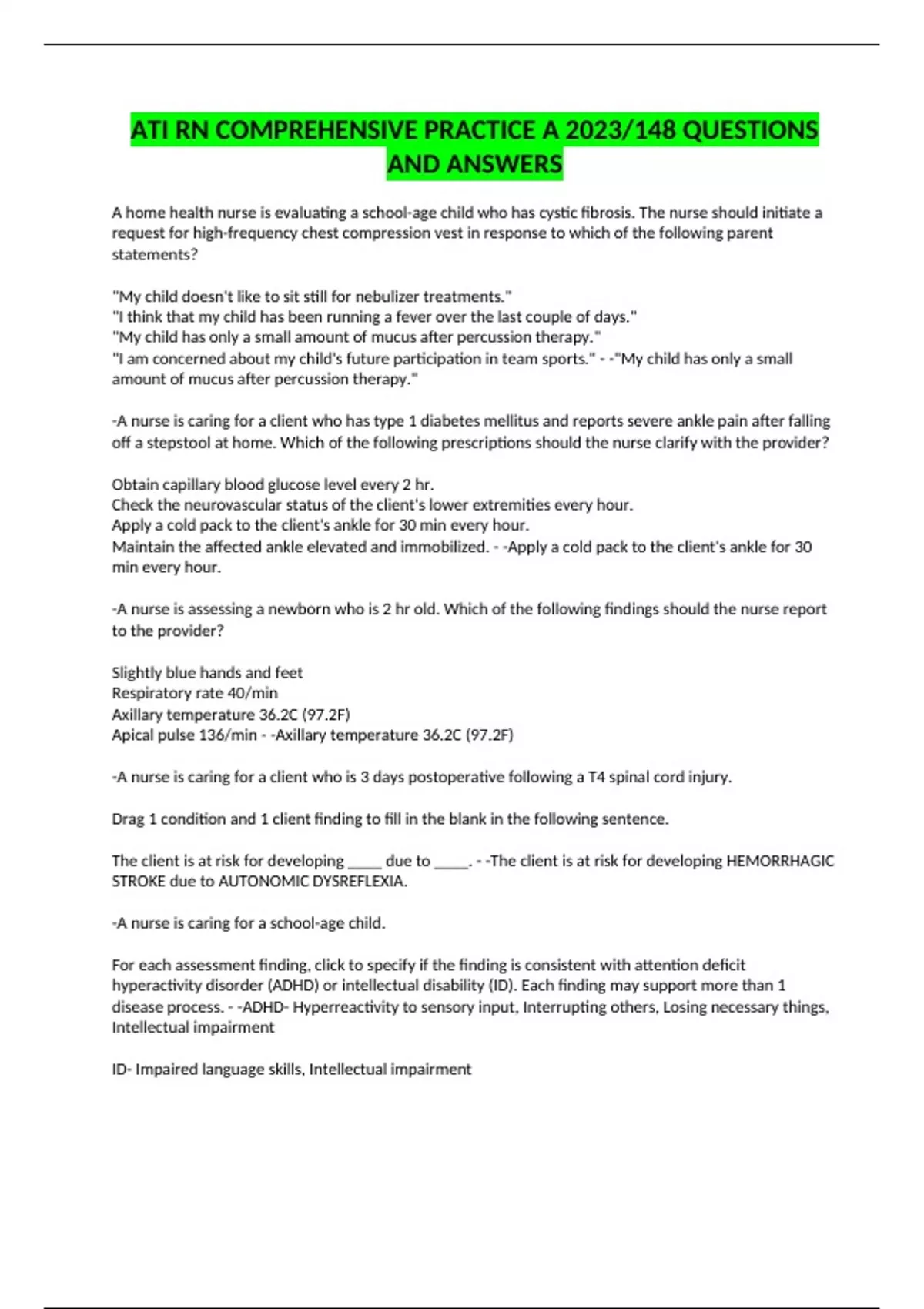 ATI RN COMPREHENSIVE PRACTICE A 2023/148 QUESTIONS AND ANSWERS