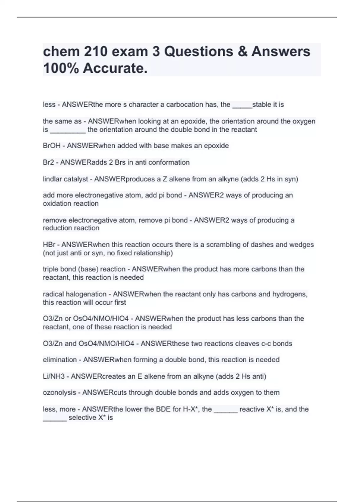 less - ANSWERthe more s character a carbocation has, the _____stable it is the same as - ANSWERwhen looking at an epoxide, the orientation around the oxygen is _________ the orientation around the double bond in the reactant BrOH - ANSWERwhen added with base makes an epoxide Br2 - ANSWERadds 2 Brs in anti conformation lindlar catalyst - ANSWERproduces a Z alkene from an alkyne (adds 2 Hs in syn) add more electronegative atom, add pi bond - ANSWER2 ways of producing an oxidation reaction remove electronegative atom, remove pi bond - ANSWER2 ways of producing a reduction reaction HBr - ANSWERwhen this reaction occurs there is a scrambling of dashes and wedges (not just anti or syn, no fixed relationship) triple bond (base) reaction - ANSWERwhen the product has more carbons than the reactant, this reaction is needed radical halogenation - ANSWERwhen the reactant only has carbons and hydrogens, this reaction will occur first O3/Zn or OsO4/NMO/HIO4 - ANSWERwhen the product has less carbons than the reactant, one of these reaction is needed O3/Zn and OsO4/NMO/HIO4 - ANSWERthese two reactions cleaves c-c bonds elimination - ANSWERwhen forming a double bond, this reaction is needed Li/NH3 - ANSWERcreates an E alkene from an alkyne (adds 2 Hs anti) ozonolysis - ANSWERcuts through double bonds and adds oxygen to them less, more - ANSWERthe lower the BDE for H-X*, the ______ reactive X* is, and the ______ selective X* is less