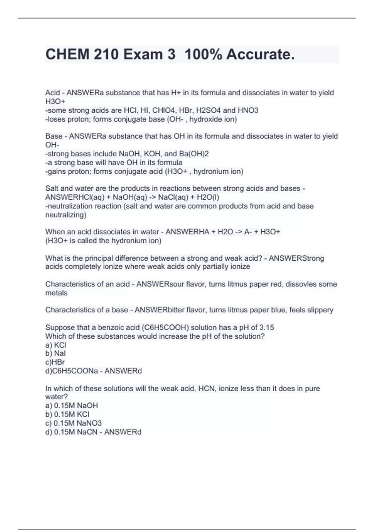 Acid - ANSWERa substance that has H+ in its formula and dissociates in water to yield H3O+ -some strong acids are HCl, HI, CHlO4, HBr, H2SO4 and HNO3 -loses proton; forms conjugate base (OH- , hydroxide ion) Base - ANSWERa substance that has OH in its formula and dissociates in water to yield OH- -strong bases include NaOH, KOH, and Ba(OH)2 -a strong base will have OH in its formula -gains proton; forms conjugate acid (H3O+ , hydronium ion) Salt and water are the products in reactions between strong acids and bases - ANSWERHCl(aq) + NaOH(aq) -> NaCl(aq) + H2O(l) -neutralization reaction (salt and water are common products from acid and base neutralizing) When an acid dissociates in water - ANSWERHA + H2O -> A- + H3O+ (H3O+ is called the hydronium ion) What is the principal difference between a strong and weak acid? - ANSWERStrong acids completely ionize where weak acids only partially ionize Characteristics of an acid - ANSWERsour flavor, turns litmus paper red, dissovles some metals Characteristics of a base - ANSWERbitter flavor, turns litmus paper blue, feels slippery Suppose that a benzoic acid (C6H5COOH) solution has a pH of 3.15 Which of these substances would increase the pH of the solution? a) KCl b) NaI c)HBr d)C6H5COONa - ANSWERd In which of these solutions will the weak acid, HCN, ionize less than it does in pure water? a) 0.15M NaOH b) 0.15M KCl c) 0.15M NaNO3 d) 0.15M NaCN - ANSWERd