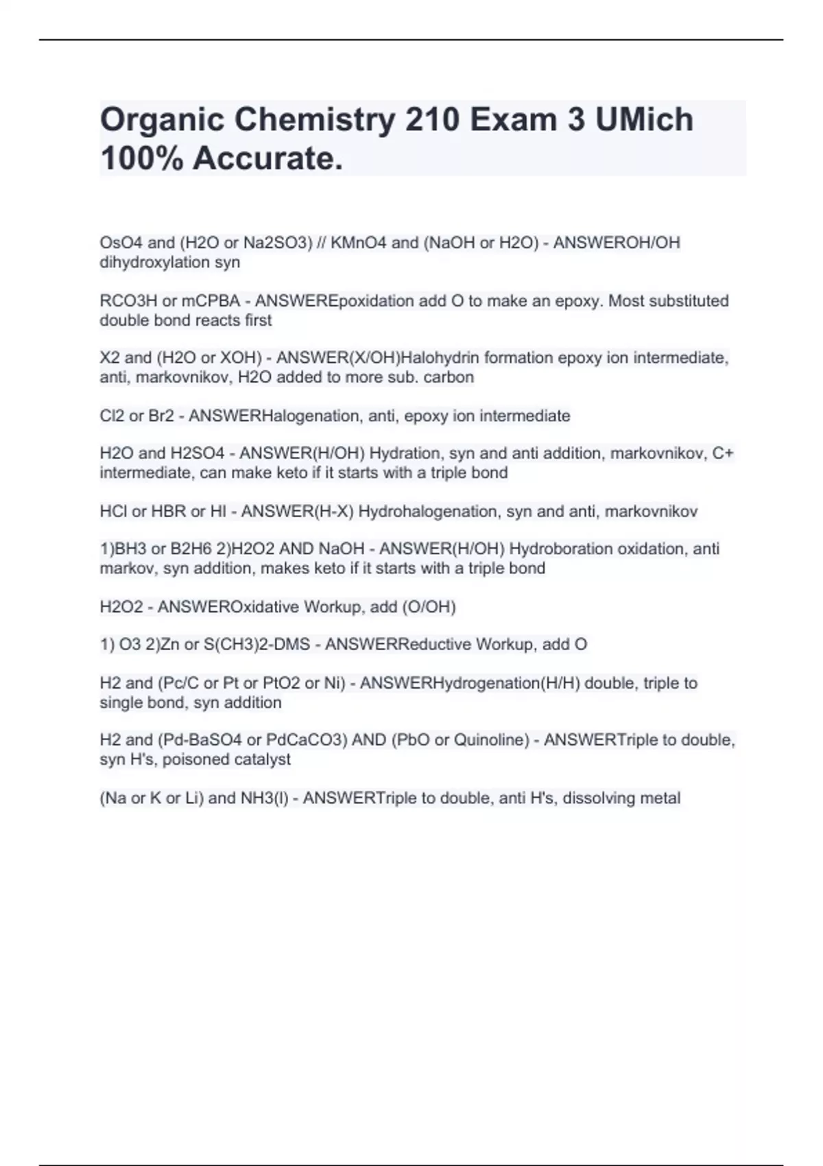 OsO4 and (H2O or Na2SO3) // KMnO4 and (NaOH or H2O) - ANSWEROH/OH dihydroxylation syn RCO3H or mCPBA - ANSWEREpoxidation add O to make an epoxy. Most substituted double bond reacts first X2 and (H2O or XOH) - ANSWER(X/OH)Halohydrin formation epoxy ion intermediate, anti, markovnikov, H2O added to more sub. carbon Cl2 or Br2 - ANSWERHalogenation, anti, epoxy ion intermediate H2O and H2SO4 - ANSWER(H/OH) Hydration, syn and anti addition, markovnikov, C+ intermediate, can make keto if it starts with a triple bond HCl or HBR or HI - ANSWER(H-X) Hydrohalogenation, syn and anti, markovnikov 1)BH3 or B2H6 2)H2O2 AND NaOH - ANSWER(H/OH) Hydroboration oxidation, anti markov, syn addition, makes keto if it starts with a triple bond H2O2 - ANSWEROxidative Workup, add (O/OH) 1) O3 2)Zn or S(CH3)2-DMS - ANSWERReductive Workup, add O H2 and (Pc/C or Pt or PtO2 or Ni) - ANSWERHydrogenation(H/H) double, triple to single bond, syn addition H2 and (Pd-BaSO4 or PdCaCO3) AND (PbO or Quinoline) - ANSWERTriple to double, syn H's, poisoned catalyst (Na or K o