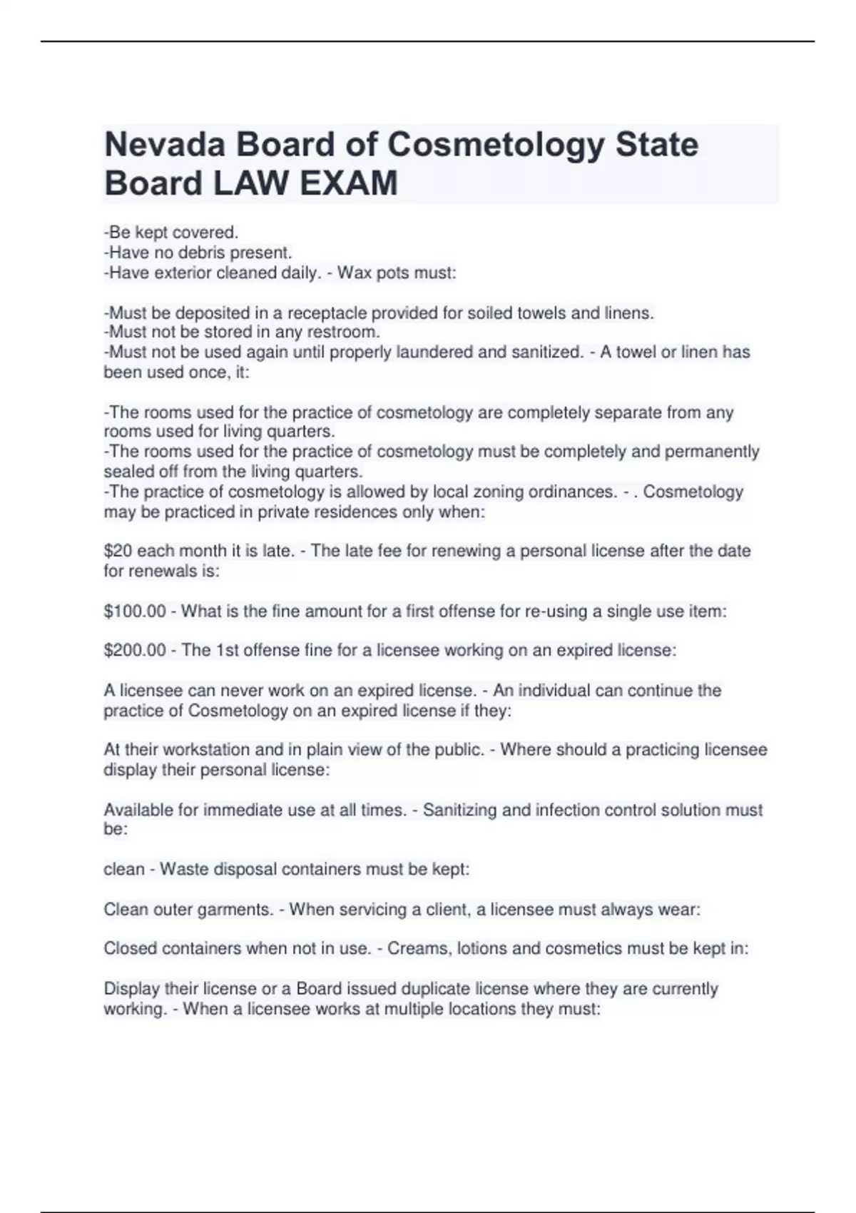 -Be kept covered. -Have no debris present. -Have exterior cleaned daily. - Wax pots must: -Must be deposited in a receptacle provided for soiled towels and linens. -Must not be stored in any restroom. -Must not be used again until properly laundered and sanitized. - A towel or linen has been used once, it: -The rooms used for the practice of cosmetology are completely separate from any rooms used for living quarters. -The rooms used for the practice of cosmetology must be completely and permanently sealed off from the living quarters. -The practice of cosmetology is allowed by local zoning ordinances. - . Cosmetology may be practiced in private residences only when: $20 each month it is late. - The late fee for renewing a personal license after the date for renewals is: $100.00 - What is the fine amount for a first offense for re-using a single use item: $200.00 - The 1st offense fine for a licensee working on an expired license: A licensee can never work on an expired license. - An individual can continue the practice of Cosmetology on an expired license if they: At their workstation and in plain view of the public. - Where should a practicing licensee display their personal license: Available for immediate use at all times. - Sanitizing and infection control solution must be: clean - Waste disposal containers must be kept: Clean outer garments. - When servicing a client, a licensee must always wear: Closed containers when not in use. - Creams, lotions and cosmetics must be kept in: Display their license or a Board issued duplicate license where they are currently working. - When a licensee works at multiple locations they must: