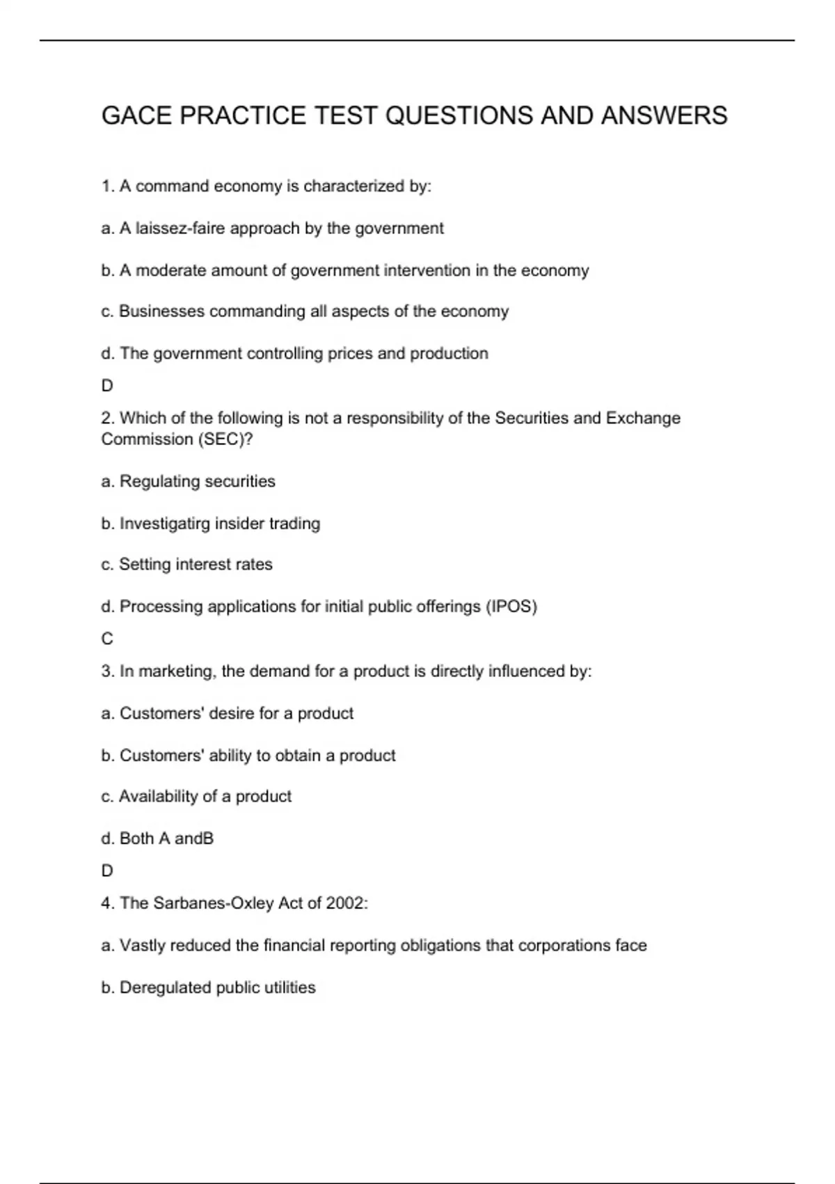 1. A command economy is characterized by: a. A laissez-faire approach by the government b. A moderate amount of government intervention in the economy c. Businesses commanding all aspects of the economy d. The government controlling prices and production D 2. Which of the following is not a responsibility of the Securities and Exchange Commission (SEC)? a. Regulating securities b. Investigatirg insider trading c. Setting interest rates d. Processing applications for initial public offerings (IPOS) C 3. In marketing, the demand for a product is directly influenced by: a. Customers' desire for a product b. Customers' ability to obtain a product c. Availability of a product d.