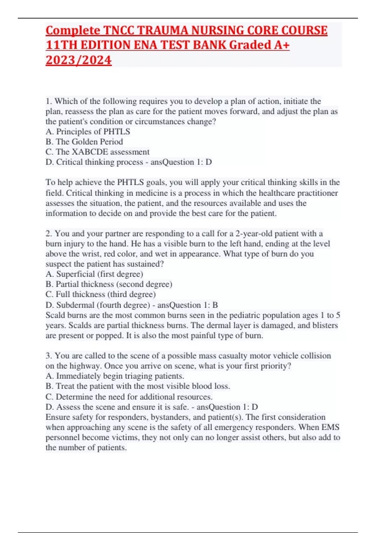 Which of the following requires you to develop a plan of action, initiate the plan, reassess the plan as care for the patient moves forward, and adjust the plan as the patient's condition or circumstances change? A. Principles of PHTLS B. The Golden Period C. The XABCDE assessment D. Critical thinking process - ansQuestion 1: D To help achieve the PHTLS goals, you will apply your critical thinking skills in the field. Critical thinking in medicine is a process in which the healthcare practitioner assesses the situation, the patient, and the resources available and uses the information to decide on and provide the best care for the patient. 2. You and your partner are responding to a call for a 2-year-old patient with a burn injury to the hand. He has a visible burn to the left hand, ending at the level above the wrist, red color, and wet in appearance. What type of burn do you suspect the patient has sustained? A. Superficial (first degree) B. Partial thickness (second degree) C. Full thickness (third degree) D. Subdermal (fourth degree) - ansQuestion 1: B Scald burns are the most common burns seen in the pediatric population ages 1 to 5 years. Scalds are partial thickness burns. The dermal layer is damaged, and blisters are present or popped. It is also the most painful type of burn. 3. You are called to the scene of a possible mass casualty motor vehicle collision on the highway. On