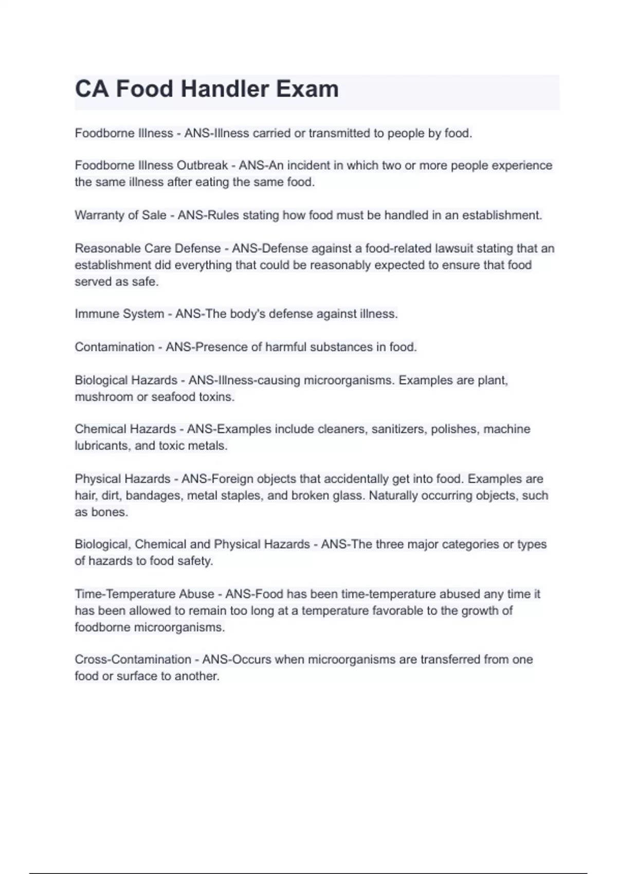CA Food Handler Exam with 100% correct answers