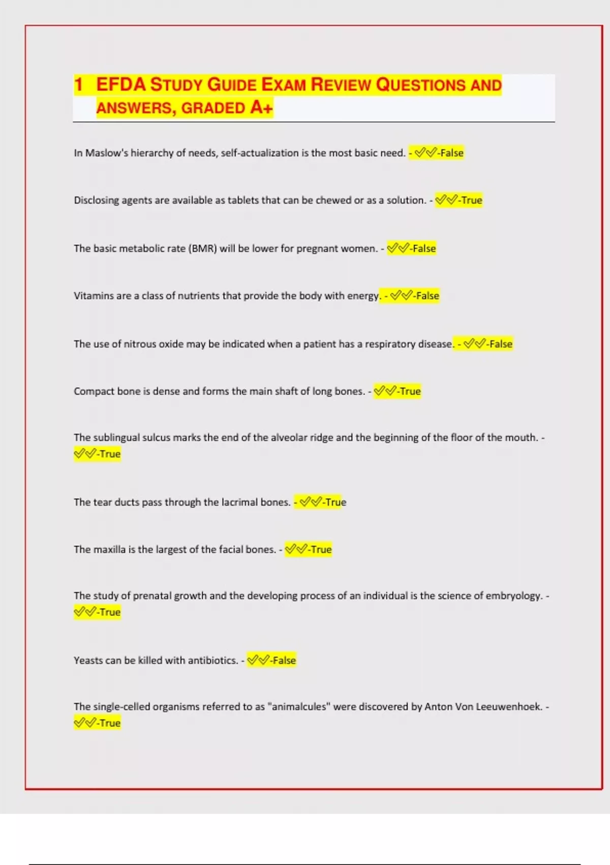 EFDA STUDY GUIDE EXAM REVIEW QUESTIONS AND ANSWERS, GRADED A+ In Maslow's hierarchy of needs, self-actualization is the most basic need. - -False Disclosing agents are available as tablets that can be chewed or as a solution. - -True The basic metabolic rate (BMR) will be lower for pregnant women. - -False Vitamins are a class of nutrients that provide the body with energy. - -False The use of nitrous oxide may be indicated when a patient has a respiratory disease. - -False Compact bone is dense and forms the main shaft of long bones. - -True The sublingual sulcus marks the end of the alveolar ridge and the beginning of the floor of the mouth. - -True The tear ducts pass through the lacrimal bones. - -True The maxilla is the largest of the facial bones. - -True The study of prenatal growth and the developing process of an individual is the science of embryology. - -True Yeasts can be killed with antibiotics. - -False The single-celled organisms referred to as "animalcules" were discovered by Anton Von Leeuwenhoek. - -True Anaerobic bacteria must have oxygen to grow and live. - -Fal