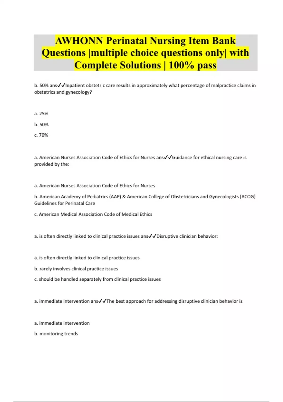 AWHONN Perinatal Nursing Item Bank Questions |multiple choice questions only| with Complete Solutions | 100% pass b. 50% ansInpatient obstetric care results in approximately what percentage of malpractice claims in obstetrics and gynecology? a. 25% b. 50% c. 70% a. American Nurses Association Code of Ethics for Nurses ansGuidance for ethical nursing care is provided by the: a. American Nurses Association Code of Ethics for Nurses b. American Academy of Pediatrics (AAP) & American College of Obstetricians and Gynecologists (ACOG) Guidelines for Perinatal Care c. American Medical Association Code of Medical Ethics a. is often directly linked to clinical practice issues ansDisruptive clinician behavior: a. is often directly linked to clinical practice issues b. rarely involves clinical practice issues c. should be handled separately from clinical practice issues a. immediate intervention ansThe best approach for addressing disruptive clinician behavior is a. immediate intervention b. monitoring trends