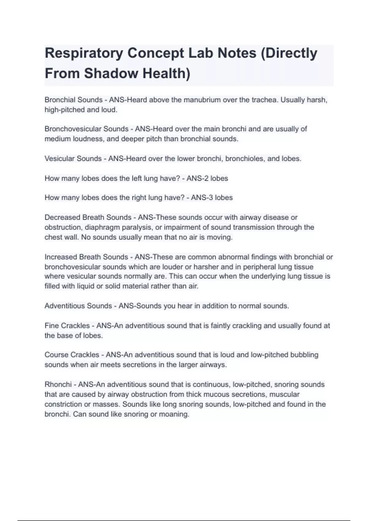 Respiratory Concept Lab Notes (Directly From Shadow Health) with 100% correct answers