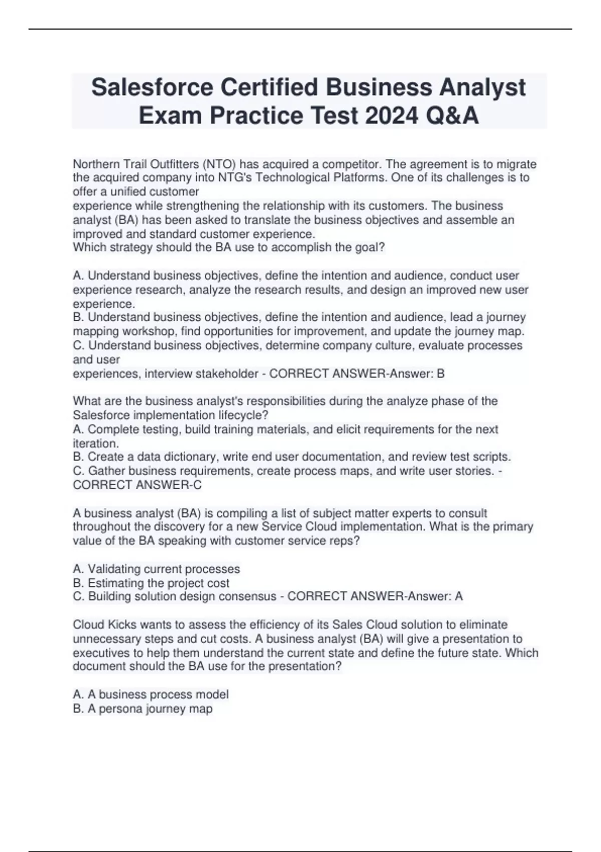 Salesforce Certified Business Analyst Exam Practice Test 2024 Q&A Northern Trail Outfitters (NTO) has acquired a competitor. The agreement is to migrate the acquired company into NTG's Technological Platforms. One of its challenges is to offer a unified customer experience while strengthening the relationship with its customers. The business analyst (BA) has been asked to translate the business objectives and assemble an improved and standard customer experience. Which strategy should the BA use to accomplish the goal? A. Understand business objectives, define the intention and audience, conduct user experience research, analyze the research results, and design an improved new user experience. B. Understand business objectives, define the intention and audience, lead a journey mapping workshop, find opportunities for improvement, and update the journey map. C. Understand business objectives, determine company culture, evaluate processes and user experiences, interview stakeholder - CORRECT ANSWER-Answer: B What are the business analyst's responsibilities during the analyze phase of the Salesforce implementation lifecycle? A. Complete testing, build training materials, and elicit requirements for the next iteration. B. Create a data dictionary, write end user documentation, and review test scripts. C. Gather business requirements, create process maps, and write user stories. - CORRECT ANSWER-C A business analyst (BA) is compiling a list of subject matter experts to consult throughout the discovery for a new Service Cloud implementation. What is the primary value of the BA speaking with customer service reps? A. Validating current processes B. Estimating the project cost C. Building solution design consensus - CORRECT ANSWER-Answer: A Cloud Kicks wants to assess the efficiency of its Sales Cloud solution to eliminate unnecessary steps and cut costs. A business analyst (BA) will give a presentation to executives to help them understand the current state and define the future state. Which document should the BA use for the presentation? A. A business process model B. A persona journey map C. A collection of use cases - CORRECT ANSWER-Answer: A Northern Trail Outfitters is starting a project to implement Service Cloud for the customer service department. Which activity should be handled by a business analyst assigned to this project? A. Work with Salesforce to purchase the necessary licenses. B. Manage existing Salesforce applications and activities. C. Understand current business processes and document existing functionality. - CORRECT ANSWER-Answer: C A business analyst has been tasked with leading prototype efforts for a Salesforce project. What is a prototype? A. A model of a final proposed product B. A first pass, simple sketch of an idea C. A polished, proven solution - CORRECT ANSWER-Answer: B A new business analyst (BA) wants to follow the correct order of phases in the implementation lifecycle on a Salesforce project. How should the BA approach the project? A. Analyze, build, operate, deliver B. Analyze, build, deliver, operate C. Analyze, operate, build, deliver - CORRECT ANSWER-Answer: B A business analyst is using storytelling to communicate the vision for a Salesforce solution to business stakeholders. Which storytelling technique should the BA use in their initial demo of a solution to business stakeholders? A. Highlight a perspective from testing feedback that identifies bugs and pain points in their business challenges. B. Give a perspective from a relatable persona that shows the development team can solve their business challenges. C. Describe a perspective from the business requirements document that addresses architectural concerns based on their business challenges. - CORRECT ANSWER-Answer: B Northern Trail Outfitters (NTO) plans to significantly grow its workforce and wants to increase the