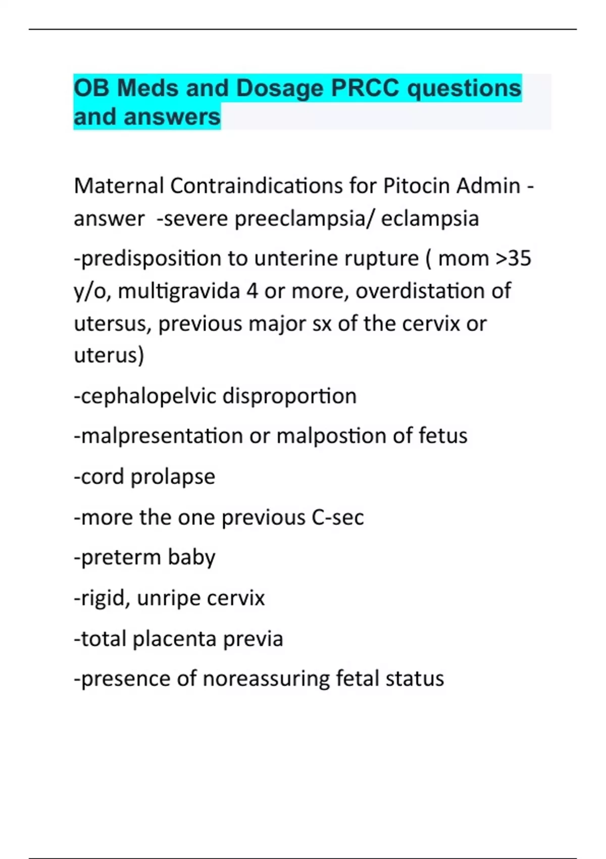 Maternal Contraindications for Pitocin Admin -severe preeclampsia/ eclampsia -predisposition to unterine rupture ( mom >35 y/o, multigravida 4 or more, overdistation of utersus, previous major sx of the cervix or uterus) -cephalopelvic disproportion -malpresentation or malpostion of fetus -cord prolapse -more the one previous C-sec -preterm baby -rigid, unripe cervix -total placenta previa -presence of noreassuring fetal status Pitocin use to initiating uterine contractions to induce labor and may also be used to enhance ineffective contractions give in port closest to the Iv insertion site Pitocin Goals to achieve stable contractions every 2-3 mins that last 40-60 seconds the uterus should relax to full baseline resting tone between each contraction Risks of pitocin Hyperstimulation of the uterus with can leas to decrease in placental perfusion and nonreassuring fetal status maternal HTN, tachysystolic labor patterns, uterine rupture, rapid labor and birth decrease in placental fnx water intoxication Fetal effects include: hypoxia non-reassuring fetal status hyperbilirubinemia trauma from rapid birth fetal bradycardia Sedative Tranquilizers in false labor, latent labor, ROM without labor minimize maternal anxiety and fear promote rest/relaxation ***Provides no pain relief Sedative/Tranquilizer in Active Labor reduces anxiety and apprehension potentiate analgesics (opiods) Minimize emesis promethazine Hydroxyzine HCL Barbituates (hypnotics) Secobarbital Sodium- SECONAL IM/PO reduce anxiety during latent phase of labor onset 15-30 mins duration 1-4 hours Pentobartial soduim-NEMBUTAL Adverse effects of Sedative Hypnotics MATERNAL paradoxically increase in pain and excitability Lethargy decrease in sensory perception hypotenison FETUS Decrease in FHR variability respiratory depression sleepiness poor suck reflex Phenothiazine derivatives Promethazine HCL-PHENERGAN antihistamine used with narcotic analgesics during 1st stage labor IM/IV Onset IM 20 mins IV 3-5 Mins IV DO NOT GIVE UNDILUTED <25mg/min give in furtherst port from IV site if given with MEPERIDINE give over several mins IM-Given Ztrack can cause extravastion and abscesses Hydroxyzine pamoate VISTARIL anxiety and PRE OP PO/ IM onset 15-30 mins peak 2 hours duration 4-6 hours Phenothiazide Derivatives (Promethazine/ Hydroxyzine) Adverse Effects- MATERNAL Confusion - dizziness Disorientation Excess sedation Hypotension Tachycardia Blurred vision Headache Restlessness Weakness Urinary retention (promethazine) Constipation (hydroxyzine) Phenothiazide Derivatives (Promethazine/ Hydroxyzine) Adverse Effects-FETUS ↓ FHR variability CNS depression Hypotonia Lethergy Poor feeding Hypthermia Narcotic Agonist Parentally or regional block reduce amt of anesthetic needed when given with neuroaxial anesthesia = ↓ side effects; ↑pain relief Fentanyl citrate SUBLIMAZE M or IV 50 to 100 x potent as morphine sulfate IV Onset 1-2 min Peak 3-5 min Duration 30 - 60 min IM : onset 7-15min; Peak 20-30min Duration 1-2 hou Nursing ConsiderationsIV inject over 3 to 5 minutes (too rapid muscle rigidity)Respiratory depression neonates (used in labor)Monitor urinary outputHerbal interactions: ↑CNS depression - St John WortContraindicated in severe asthmaNaloxone- antidot Fentanyl Nursing Considerations IV inject over 3 to 5 minutes (too rapid muscle rigidity Respiratory depression neonates (used in labor) Monitor urinary output