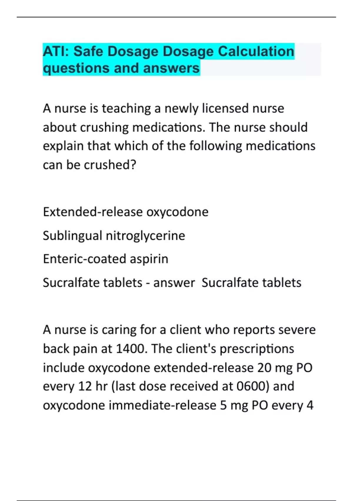A nurse is teaching a newly licensed nurse about crushing medications. The nurse should explain that which of the following medications can be crushed? Extended-release oxycodone Sublingual nitroglycerine Enteric-coated aspirin Sucralfate tablets Sucralfate tablets A nurse is caring for a client who reports severe back pain at 1400. The client's prescriptions include oxycodone extended-release 20 mg PO every 12 hr (last dose received at 0600) and oxycodone immediate-release 5 mg PO every 4 hr PRN (last dose received at 2300 the day before). Which of the following actions should the nurse take? Contact the provider to request an order for a different pain medication. Administer oxycodone immediate-release 5 mg PO at 1600. Administer oxycodone immediate-release 5 mg PO now. Contact the provider to request an increase in the oxycodone extended-release dose. Administer oxycodone immediate-release 5 mg PO now. A nurse is reviewing a client's prescriptions. The nurse should contact the provider to clarify which of the following prescriptions? Phenytoin 100 mg PO every 8 hr Morphine 2.5 mg IV bolus PRN for incisional pain Regular insulin 7 units subcutaneous 30 min before breakfast and dinner Lisinopril 20 mg PO every 12 hr. Hold for systolic BP less than 110 mm Hg Morphine 2.5 mg IV bolus PRN for incisional pain A nurse is preparing to administer an oral medication. Which of the following actions should the nurse take? (Select all that apply.) Provide client education about the medication. Check the expiration date of the medication. Verify the dosage of the medication. Call the client by name to confirm their identity. Ask the client if they have any allergies. Provide client education about the medication. Check the expiration date of the medication. Verify the dosage of the medication. Ask the client if they have any allergies. A nurse is caring for a client who states that his provider told him he is at risk for anaphylaxis following administration of amoxicillin and that he does not understand what this means. Which of the following is an appropriate response by the nurse? "Anaphylaxis is a predictable and often unavoidable secondary effect that can occur at a usual therapeutic dose." "Anaphylaxis will cause you to experience withdrawal symptoms when you discontinue taking the medication." "Anaphylaxis is an unusual response that can occur due to an inherited predisposition." "Anaphylaxis is a severe hypersensitivity or allergic reaction that is life-threatening." "Anaphylaxis is a severe hypersensitivity or allergic reaction that is life-threatening." A nurse discovers a medication error in which the client received twice the prescribed amount of medication. Which of the following actions should the nurse take first? Notify the provider. Complete an incident report. Assess the client. Report the error to the nurse manager. Assess the client. A nurse is preparing to administer digoxin 225 mcg for a pediatric client who has a heart rate above 90/min. Which of the following actions should the nurse take to ensure administration of the right dose? (Select all that apply.) Validate that the dosage is within the safe range. Confirm the medication amount is appropriate for the child. Verify that the medication is not expired. Check the client's heart rate prior to administration. Document the administration in the medication administration record. Validate that the dosage is within the safe range. Confirm the medication amount is appropriate for the child.