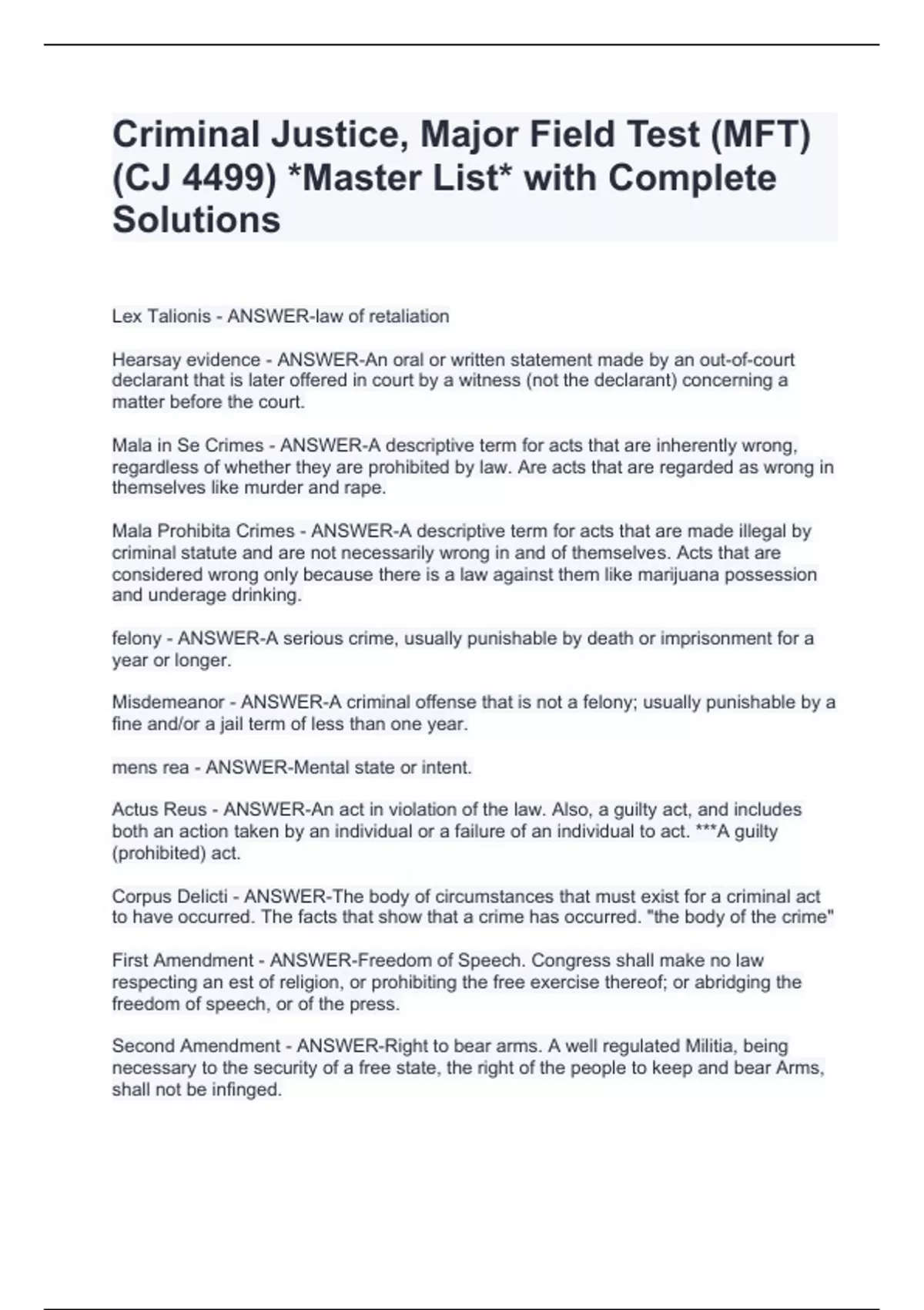 Criminal Justice, Major Field Test (MFT) (CJ 4499) *Master List* with Complete SolutionsCriminal Justice, Major Field Test (MFT) (CJ 4499) *Master List* with Complete SolutionsCriminal Justice, Major Field Test (MFT) (CJ 4499) *Master List* with Complete Solutions Lex Talionis - ANSWER-law of retaliation Hearsay evidence - ANSWER-An oral or written statement made by an out-of-court declarant that is later offered in court by a witness (not the declarant) concerning a matter before the court. Mala in Se Crimes - ANSWER-A descriptive term for acts that are inherently wrong, regardless of whether they are prohibited by law. Are acts that are regarded as wrong in themselves like murder and rape. Mala Prohibita Crimes - ANSWER-A descriptive term for acts that are made illegal by criminal statute and are not necessarily wrong in and of themselves. Acts that are