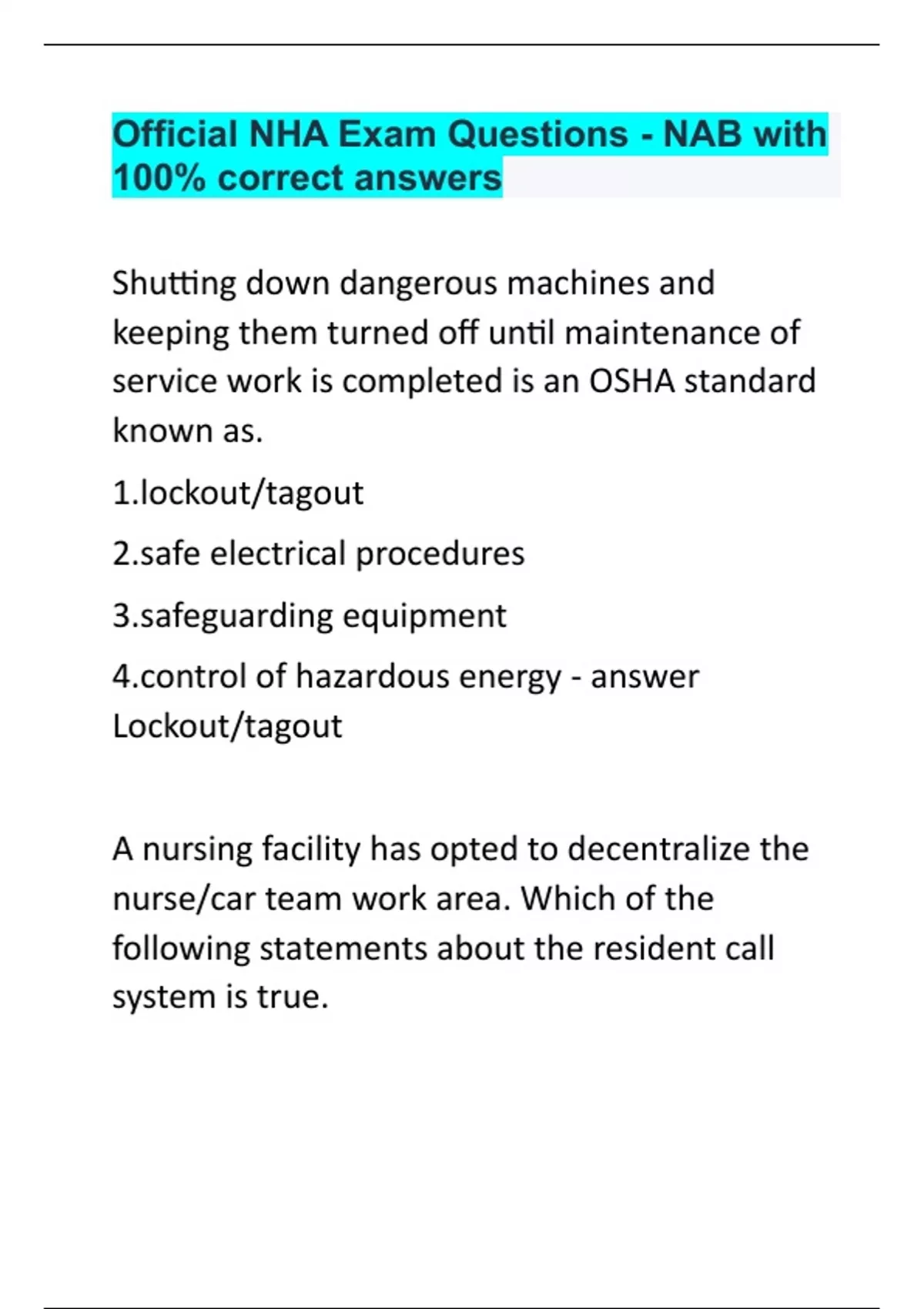 Shutting down dangerous machines and keeping them turned off until maintenance of service work is completed is an OSHA standard known as. ut/tagout electrical procedures uarding equipment ol of hazardous energy Lockout/tagout A nursing facility has opted to decentralize the nurse/car team work area. Which of the following statements about the resident call system is true. 1.The chosen electronic system must provide direct communication between the resident and the caregivers 2.A wireless nurse call system must be installed and approved by the fire marshal 3.The facility must maintain its current electronic system and keep at least one nurse's station 4.The facility must provide all residents with a communication device to keep in their possession 1.The chosen electronic system must provide direct communication between the resident and the caregivers If hand washing is not feasible and hands are not soiled, it is permissible to use: 1.Hydrogen peroxide solutions 2.Nonsocomial solutions 3.Alcohol-based solutions 4.Diluted chlorine solutions 1.Alcohol-based solutions A Notice of Discharge or Transfer from Nursing Facility must be given to the resident at least how long before the resident is transferred? 1.30 days 2.45 days 3.60 days 4.90 days 1.30 days Within how many days of completing a resident assessment must it be electronically transmitted to the CMS system? 1.7 2.10 3.14 4.30 3.14 A statement that presents the job to be done along with associated duties and responsibilities is known as a job: 1.Description 2.Specification 3.Classification 4.Analysis 4.Analysis Under the Code of Federal Regulations, nursing facilities are required to offer in service training based on performance evaluations to all: 1.Employees of a skilled nursing facility regardless of job duties 2.Employees directly involved in providing care to nursing facility residents 3.Nursing staff providing direct care to nursing facility residents 4.Certified nurse aids (CNAs)performing nursing and nursing related services 4.Certified nurse aids (CNAs) performing nursing and nursing related services A reciprocal arrangement between a community hospital and a nursing facility to ensure the provision of medically appropriate services is commonly referred to as a: 1.Support Network Contract 2.Transfer Agreement 3.Community Transition Agreement 4.Shared Service Agreement 2.Transferred Agreement The government agency of the Department of Health and Human Services responsible for regulating long-term care facilities is the: 1.Counsel of American Building Codes(CABC) 2.Occupational Safety and Health Administration (OSHA) 3.National Fire and Protection Agency(NFPA) 4.Centers for Medicare and Medicaid Services (CMS) 4.Centers for Medicare and Medicaid Services (CMS) A nursing Facility wants to receive a discount on civil monetary penalties. How many days does it have to request the discount from the notice of the date of imposition? 1.5 days 2.7 days 3.60 days 4.90 days 3.60 days A nursing facility wishes to challenge a deficiency using the informal dispute resolution (IDR) process. Which of the following statements regarding IDR is true? 1.The facility can use the IDR process to delay the formal imposition of a remedy 2.The request for an IDR must be within five days of the receipt of the statement of deficiencies 3.The scope and severity of a deficiency that constitutes substandard or care or immediate jeopardy can be challenged ombudsman should be included on the IDR team 3.The scope and severity of a deficiency that constitutes substandard care or immediate jeopardy can be challenged A resident call system must allow the nurses' station to relieve calls from any: 1.Dining area 2.Therapy room 3.Medication room 4.Toilet and bathing area 4.Toilet and bathing area