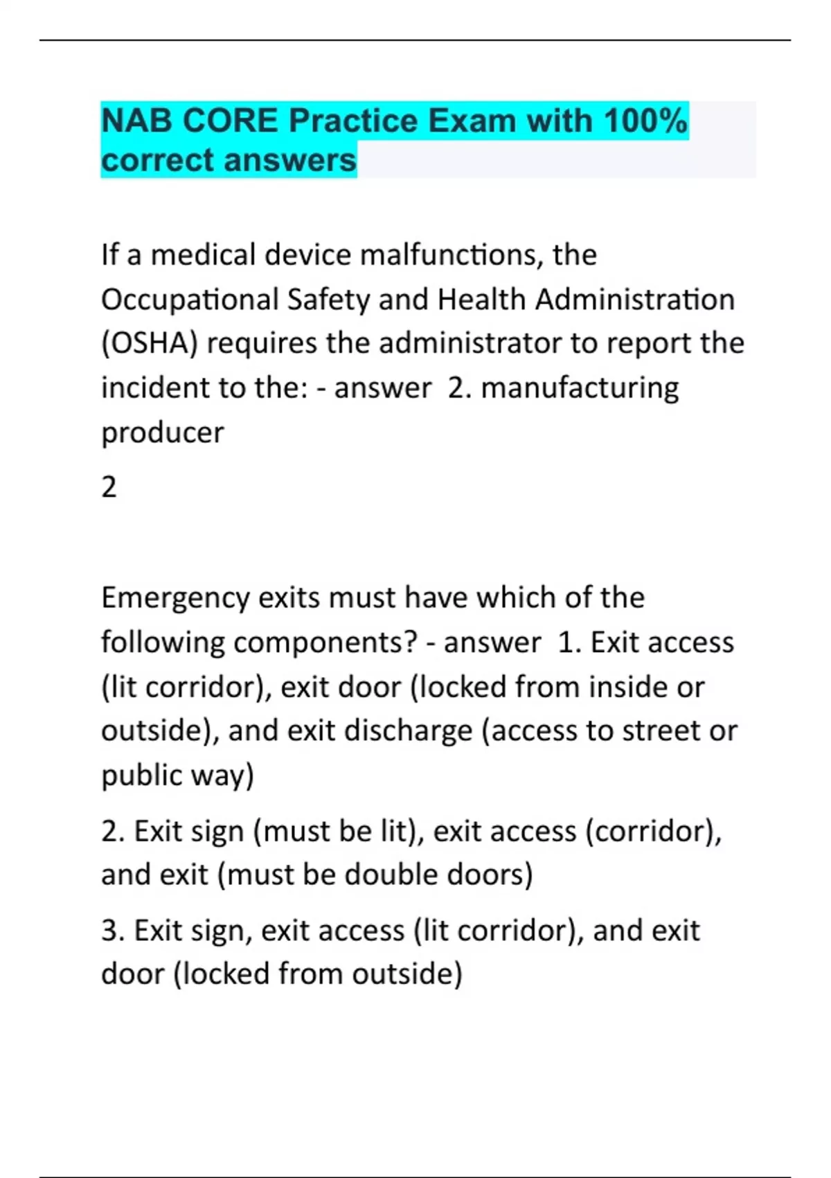 If a medical device malfunctions, the Occupational Safety and Health Administration (OSHA) requires the administrator to report the incident to the: 2. manufacturing producer 2 Emergency exits must have which of the following components? 1. Exit access (lit corridor), exit door (locked from inside or outside), and exit discharge (access to street or public way) 2. Exit sign (must be lit), exit access (corridor), and exit (must be double doors) 3. Exit sign, exit access (lit corridor), and exit door (locked from outside) 4. Exit access (lit corridor), exit (must be double doors), and exit discharge (three feet of clear sidewalk) 1 Which of the following Occupational Safety and Health Administration (OSHA) violations is least likely to be associated with a fine? 1. Serious 2. Non-serious 3. De minimus 4. imminent danger 3 The administration of the budget by the administrator: 1. requires intervention by the governing body 2. is more costly than by staff 3. is a controlling function 4. is also part of the planning 1 Healthcare organizations are in the business of marketing: 1. assistance 2. compassion 3. wellness 4. services 4 A care recipient in a long-term care healthcare organization disagrees with management's decision regarding an aspect of care. The care recipient feels that is could adversely affect the health, safety, welfare, or rights of care recipients. The individual or group most responsible for acknowledging, investing, and resolving the concern is the: 1. ombudsman 2. social worker 3. care recipient council president 4. governing body 2 Stakeholders are defined as: 1. any constituent group that has an interest in what outcomes the organization procedures 2. the individuals who have the most to lose financially if the organization closes 3. any group of investors who own stock in the organization 4. the staff, physicians, and local groups who want to see the organization succeed 3 The purpose of a corporate compliance plan is to: 1. reduce fraud and abuse and to establish internal controls for responsible organization conduct 2. avoid charges of price-fixing and the violation of federal anti-kickback statutes 3. identify the corrective steps necessary for the removal of quality indicator flags from a healthcare organization's profile 4. establish policies and procedures for conducting criminal background checks on all officers and directors 1 The primary benefits of management by walking around are: 1. listening, teaching, and facilitating 2. evaluating, controlling, and planning 3. listening, planning, and organizing 4. directing, evaluating, and innovating 3 What function of the management process includes gathering information and input? 1. Directing 2. Decision-making 3. Controlling 4. Organizing 4 Management by walking around is an approach that allows the administrator to: 1. see first-hand the needs of the care recipient 2. control the staff in order to minimize care recipient and family complaints 3. ensure the healthcare organization's license is not in jeopardy due to regulatory compliance 4. innovate new approaches and physical plant improvements to enhance public relations 1 Bylaws are defined as: 1. corporate duties delegated to the administrator 2. state laws establishing the healthcare organization's scope of practice 3. adopted rules governing the internal affairs of an organization 4. the rules whereby a corporation is created under the laws of a state 3 Another term for articles of incorporation is: 1. charter 2. by-laws 3. constitution 4. governing rules 1 The law may hold the organization liable for the fort committed by each of the following individuals except an: 1. independent contractor 2. employed attending physician 3. administrator 4. officer of the late organization 1 A comprehensive decision-making process based on future predictions that establishes the blueprint for a healthcare organization strategy is: 1. the best way to establish day-to-day staffing needs 2. an effective process in analyzing market conditions 3. an effective tool to create a mission statement 4. the purpose of planning 2 The style of leadership that encourages and values the input of staff is known as: 1. democratic leadership 2. participative leadership 3. autocratic leadership 4. directional leadership 2 Procedures are best defined as: 1. step-by-step instructions for how a specific task is to be carried out 2. statements that contain some degree of freedom with further interpretation needed 3. operational statements that are handed down from the governing body to the administrator 4. statements that are governed by the caregiver council 1 The term ethics deals with: 1. the proper procedure and protocol between purchasing department vendors 2. the decision-making process of determining the ultimate values and standards by which we judge our actions 3. the ombudsman process of advocating and conveying a care recipient concerns to management 4. personality conflicts between co-workers and/or between staff and management 2 Principles that reflect the moral foundation and guiding ideology of an organization are best described as its: 1. philosophy 2. mission 3. vision 4. values 4 When a family is being interviewed regarding a provision of services, the first course of action should be to: 1. discuss the healthcare organization's rate structure 2. inquire about the potential care recipient's needs 3. give tour of the healthcare organization 4. talk about the healthcare organization's strengths compared to the competition's 2 When marketing a healthcare organization, the market is considered to be all of the individuals: 1. living within an established radius of the healthcare organization 2. enrolled in the Medicaid or Medicare programs 3. with a demand for their service of product 4. discharging from an acute care hospital 3 Ethics are the beliefs or attitudes that make up which kind of organizational values? 1. Humanitarian 2. Religious 3. Moral 4. Civic 3 A cognitive care reci