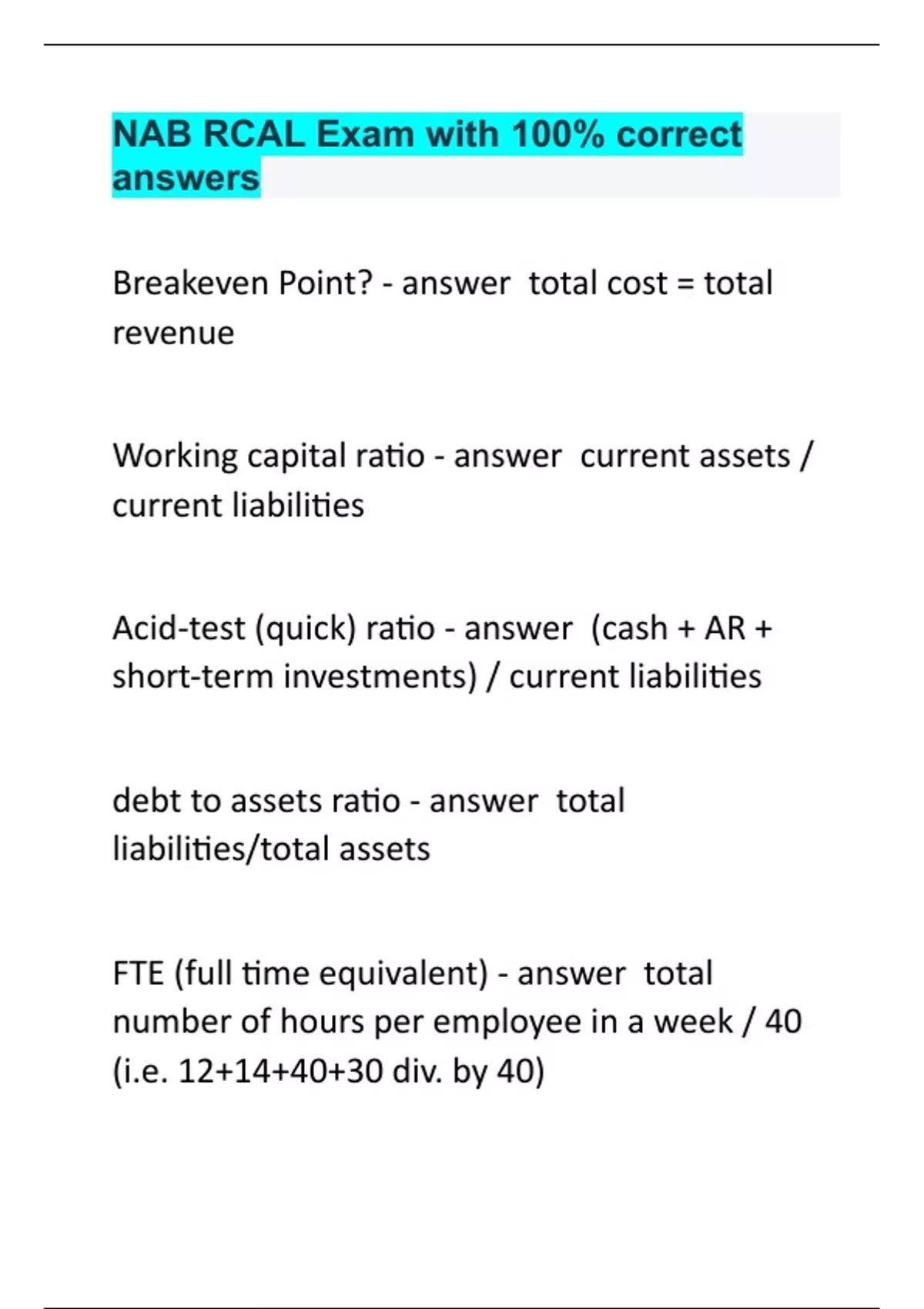 Breakeven Point? total cost = total revenue Working capital ratio current assets / current liabilities Acid-test (quick) ratio (cash + AR + short-term investments) / current liabilities debt to assets ratio total liabilities/total assets FTE (full time equivalent) total number of hours per employee in a week / 40 (i.e. 12+14+40+30 div. by 40) Profit margin NOI/Tot. Revenue. Defined as "income to sales. 2 types, gross prof margin and net prof margin) Net Operating Income (NOI) Total (gross) Revenue - operating expenses Occupancy rate (# of resident days/facility beds) x 365 HCS Hazard Communication Standard. OSHA standard requiring employers to inform workers of potentially hazardous chemicals. Balance sheet formula Assets = Liabilities + Shareholders Equity EBITDA Earnings before interest, taxes, depreciation, and amortization Amortization the reduction of a loan balance through payments made over a period of time revenue cycle management resident needs->service planning->staffing->billing/collections-> FICA SS Tax and Medicare Tax 6.2% and 1.45% 4 elements of a valid contract agreement, consideration, contractual capacity, legality (in writing) "ACCL" Liability insurance usually covers.. Bodily injury and property damage Lock out tag out For all electrical equipment safe electrical practices National Electrical Code or NEC Following NFPA Life Safety Code fire plan, regular fire drills, detectors, training on procedure, non combustable furnishing/draperies Extinguisher class A ordinary combustibles such as wood/paper Extinguisher Class B For flammable liquids and gas fires (grease, paint) Extinguisher class C Live electrical equipment (panelling) Extinguisher class D Combustable metals (aluminum) Extinguisher class K Commercial cooking equipment (cooking oil, animal fats) PASS (Fire Safety) P - Pull the pin. A - Aim at the base of the fire, not at the flames. S - Squeeze the lever. S - Sweep the nozzle from side to side. R.A.C.E. (Fire safety) rescue, alarm, contain, extinguish Accrual Basis Accounting reporting income when it is earned and expenses when they are incurred Cash Basis Accounting Reporting income when the cash is received and expenses when the cash is paid. LLC (Limited Liability Company) Limited liability, pass through income taxation, flexibility S corporation A unique government creation that looks like a corporation but is taxed like sole proprietorships and partnerships Net Worth Formula Assets - Liabilities Dementia Living Environment Residential living with clinical aspects. safe, quiet, secured Effective Claims Management for working with insurance agencies components of the claims handling process