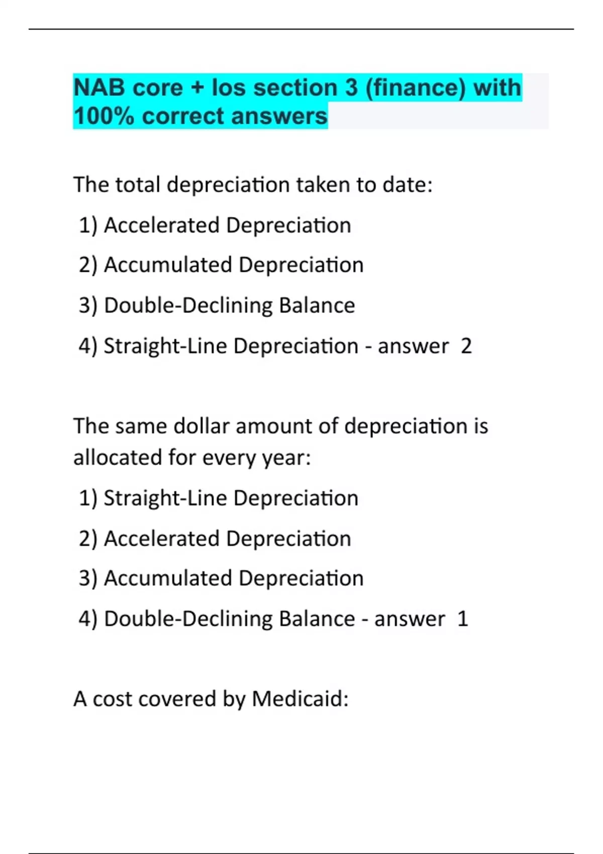 The total depreciation taken to date: 1) Accelerated Depreciation 2) Accumulated Depreciation 3) Double-Declining Balance 4) Straight-Line Depreciation 2 The same dollar amount of depreciation is allocated for every year: 1) Straight-Line Depreciation 2) Accelerated Depreciation 3) Accumulated Depreciation 4) Double-Declining Balance 1 A cost covered by Medicaid: 1) Allowable 2) Ancillary 3) Indirect 4) Direct 1 A financial report showing receipts and disbursements: 1) Earnings Statement 2) Balance Sheet 3) Cash Flow Statement 4) Bank Statement 3 A complete list of all categories of accounts: 1) Chart of Accounts 2) Ledger 3) Invoice 4) Journal 1 The decline in value of an asset: 1) Debit 2) Depreciation 3) Deficit 4) Current Liability 2 A statement which compares revenues to expenses: 1) Balance Sheet 2) Bank Statement 3) Cash Flow Statement 4) Earnings Statement 4 Debt due within one year: 1) Deficit 2) Debit 3) Depreciation 4) Current Liability 4 A method of depreciation which allocates a greater portion of cost to the early years of the life of an asset: 1) Accumulated Depreciation 2) Straight-Line Depreciation 3) Accelerated Depreciation 4) Double-Declining Balance 3 An accounting entry that increases an asset or decreases an equity account: 1) Debit 2) Deficit 3) Current Liability 4) Depreciation 1 Where financial transactions are first recorded: 1) Journal 2) Chart of Accounts 3) Invoice 4) Ledger 1 Net sales less production costs: 1) Net Profit 2) Gross Profit 3) Operating Profit 4) Net Worth 2 A cost incurred in providing services: 1) Allowable 2) Ancillary 3) Direct 4) Indirect 3 The part of Medicare that gives access to prescription drug insurance: 1) Part D 2) Part A 3) Part B 4) Part C 1 A document given to a purchaser of goods or services: 1) Invoice 2) Chart of Accounts 3) Journal 4) Ledger 1 The value of shares issued by a company: 1) Equities 2) Revenue 3) Gross income 4) Earnings 1 The inflow of assets: 1) Equities 2) Revenue 3) Gross income 4) Earnings 2 Assets less liabilities: 1) Net Profit 2) Gross Profit 3) Net Worth 4) Operating Profit 3 The inventory method that assumes that that the value of goods remaining in inventory is lower than the value of goods already used: 1) Average Cost Method 2) First-In, First-Out 3) Last-In, First Out 4) Perpetual 3 A statement which provides an account balance: 1) Earnings Statement 2) Bank Statement 3) Balance Sheet 4) Cash Flow Statement 2 The part of Medicare that is provided by a private insurance company: 1) Part C 2) Part B 3) Part A 4) Part D 1 Revenue less expenses: 1) Gross income 2) Earnings 3) Revenue 4) Equities 2 The part of Medicare that reimburses hospitals: 1) Part A 2) Part C 3) Part B 4) Part D 1 Costs incurred that are not directly involved in resident care: 1) Ancillary 2) Direct 3) Allowable 4) Indirect 4