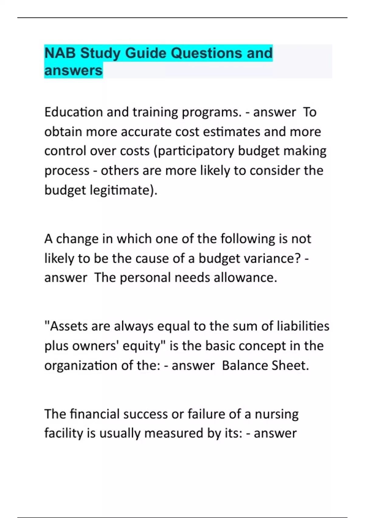 Education and training programs. To obtain more accurate cost estimates and more control over costs (participatory budget making process - others are more likely to consider the budget legitimate). A change in which one of the following is not likely to be the cause of a budget variance? The personal needs allowance. "Assets are always equal to the sum of liabilities plus owners' equity" is the basic concept in the organization of the: Balance Sheet. The financial success or failure of a nursing facility is usually measured by its: Return on Equity (net income - i.e., revenues in excess of expenses) and divides it by owners' equity). If a facility has a current ratio greater than 1, which of the following statements is most likely to be true? It will be able to pay its bills on time (current ratio greater than 1 means that the organization's current assets exceed its current liabilities, and this indicates a good ability to pay short-term liabilities as they come in). A check should generally be issued only when which one of the following is available and properly signed? Purchase Order. The importance of matching revenue with the expenses incurred in generating those revenues is the reason for recording which one of the following? Depreciation (the purpose of recognizing depreciation is to satisfy the Matching Principle (GAAP) stated in this question). Using the straight-line method, what would be the annual depreciation expense for a piece of equipment having a cost of $6,000.00, a manufacturer's warranty for 2 years, and an estimated useful life of 6 years? $1,000. Which of the following is a current asset? Accounts Receivables. Under the accrual basis of accounting, revenues are recorded when _______ and expenses are recorded when ______________. Revenues are earned - expenses are incurred. A generally accepted accounting principle (GAAP) would be violated if a company: Used in its balance sheet an optimistic estimate of the current market value of its building (the use of current market value rather than historical costs would not be consistent with the Objectivity GAAP, and the use of an optimistic rather than conservative estimate would violate the Conservatism GAAP). Last year's food costs for a 100-bed facility were $146,820. The facility had an average occupancy rate of 85% that year. What was this facility's food cost per patient day (PPD)? $4.73 The Medicare benefit period ends when a beneficiary Has had 60 straight days with neither any hospital days nor SNF days Medicare Part A coverage of skilled nursing facility (SNF) care entails out-of-pocket payment by the patient of a daily amount for which days of SNF care in a benefit period? 21st through 100th Which of the following statements is NOT true regarding the Medicare Prospective Payment System for Skilled Nursing Facilities? There are separate prospective rates for capital-related costs (Medicare does not make separate reimbursement to SNFs for capital-related costs. The RUG rate that the facility receives is expected to cover all types of costs). A RUG is a: Category in a resident classification system. Completion of the Medicare cost report requires carrying out all except which one of the following tasks? Aging of accounts receivable. The term for unintentional improper or excessive use of benefits of a health insurance program is: Abuse. The process by which an individual becomes eligible for Medicaid by incurring medical expenses until personal resources fall below a specified ceiling is called: Spend Down Which of the following statements regarding budgeting procedure is correct? A cash budget may provide advance warning of months when cash outlays fall short of cash receipts. An example of a variable cost is: Nursing supplies. If the facility's occupancy increases from 94% to 98%, the fixed cost per resident Decreases slightly (Fixed cost per resident is calculated by dividing total fixed costs by number of residents (currently-occupied beds). If the occupancy rate increases slightly, fixed costs do not change (by definition), and number of residents increase, resulting in a decreased fixed cost per resident. Another way of saying this is that the fixed costs are spread over a larger number of residents. A nursing home is considering the purchase of a new dish-washing machine that costs $6,000 and has a useful life of 10 years (with no salvage value). It is estimated that the machine will reduce annual operating costs by $800 over each of the next ten years. What is the payback period? 7.50 years.