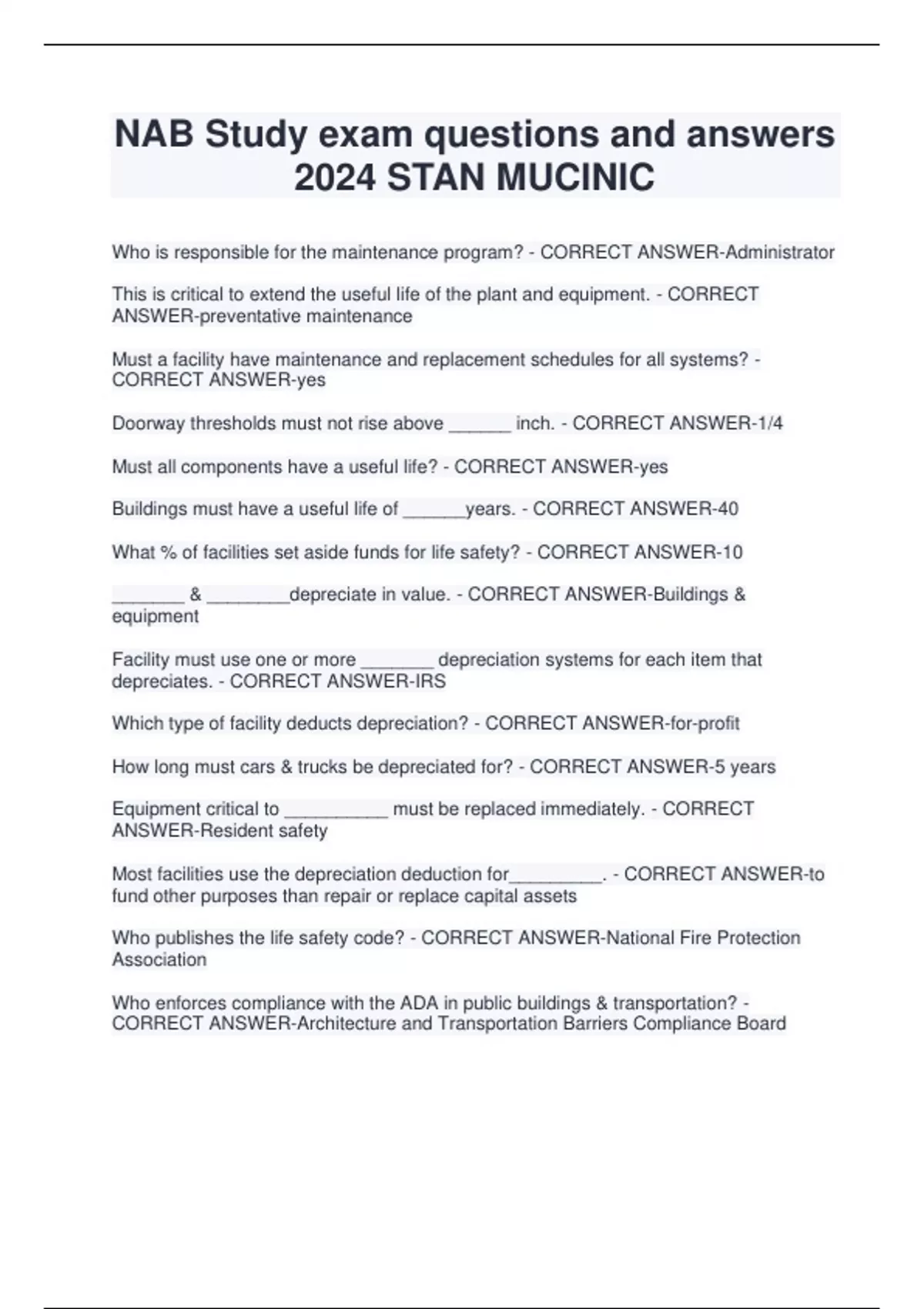 NAB Study exam questions and answers 2024 STAN MUCINIC Who is responsible for the maintenance program? - CORRECT ANSWER-Administrator This is critical to extend the useful life of the plant and equipment. - CORRECT ANSWER-preventative maintenance Must a facility have maintenance and replacement schedules for all systems? - CORRECT ANSWER-yes Doorway thresholds must not rise above ______ inch. - CORRECT ANSWER-1/4 Must all components have a useful life? - CORRECT ANSWER-yes Buildings must have a useful life of ______years. - CORRECT ANSWER-40 What % of facilities set aside funds for life safety? - CORRECT ANSWER-10 _______ & ________depreciate in value. - CORRECT ANSWER-Buildings & equipment Facility must use one or more _______ depreciation systems for each item that depreciates. - CORRECT ANSWER-IRS Which type of facility deducts depreciation? - CORRECT ANSWER-for-profit How long must cars & trucks be depreciated for? - CORRECT ANSWER-5 years Equipment critical to __________ must be replaced immediately. - CORRECT ANSWER-Resident safety Most facilities use the depreciation deduction for_________. - CORRECT ANSWER-to fund other purposes than repair or replace capital assets Who publishes the life safety code? - CORRECT ANSWER-National Fire Protection Association Who enforces compliance with the ADA in public buildings & transportation? - CORRECT ANSWER-Architecture and Transportation Barriers Compliance Board Who enforces compliance with the ADA regarding discrimination in hiring of people with disabilities? - CORRECT ANSWER-EEOC - Equal Employment Opportunity Commission Where are federal regulations published? - CORRECT ANSWER-Federal Register What does a facility need to document and communicate maintenance needs? - CORRECT ANSWER-procedures A facility must _________ maintenance needs. - CORRECT ANSWER-prioritize The 3 elements of an effective maintenance program: - CORRECT ANSWER-1 - good record keeping, 2 - document repair requests, turnaround times and costs, & 2 - identify equipment requiring major repairs