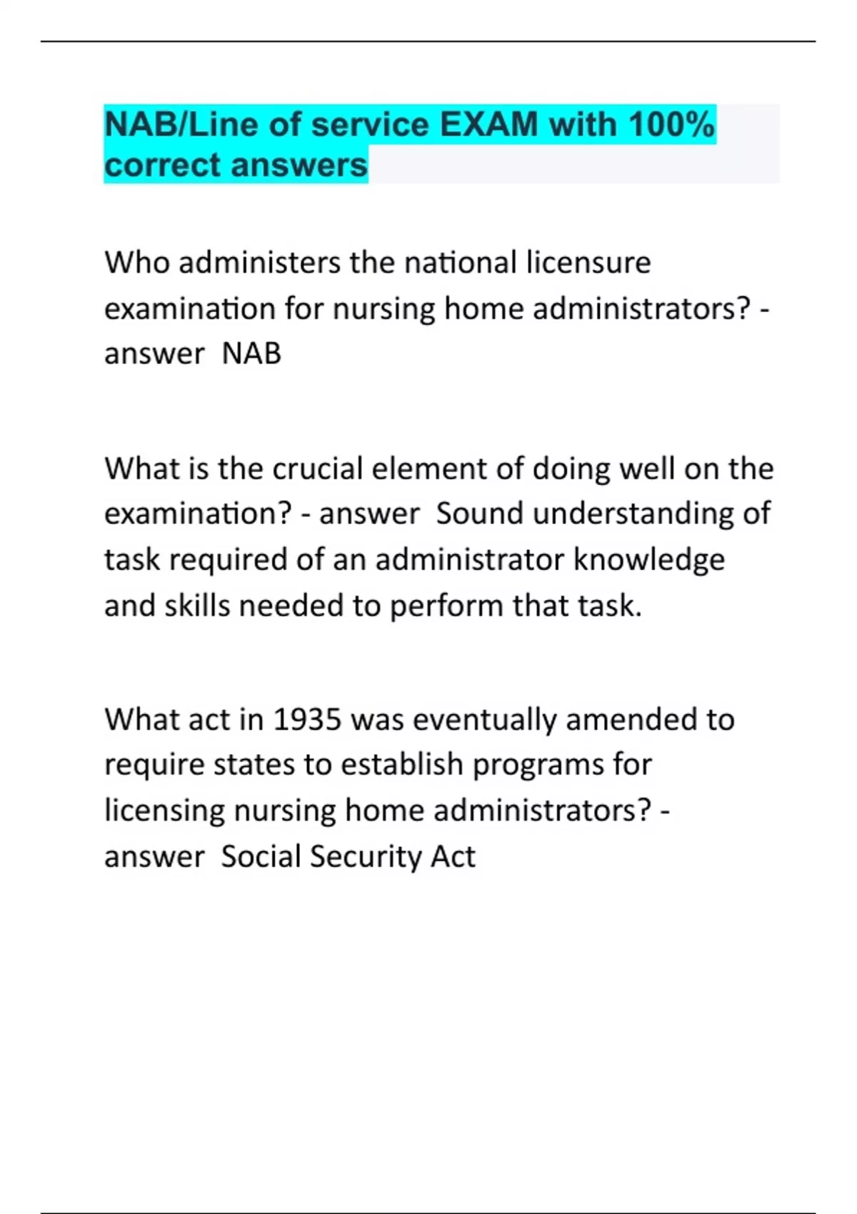 Who administers the national licensure examination for nursing home administrators? NAB What is the crucial element of doing well on the examination? Sound understanding of task required of an administrator knowledge and skills needed to perform that task. What act in 1935 was eventually amended to require states to establish programs for licensing nursing home administrators? Social Security Act How many non-certified (not Medicare or Medicaid) nursing facilities are in the US? Unknown Number Professionals who study the economic, social, and psychological aspects of the aging population are called what? Gerontologist A physician who specializes in the diagnosis, management, and prevention of disease and chronic illness of the elderly population is known as what? Geriatrician A discrimination of prejudice action towards a person because of age is known as what? Ageism Staff having the tendency to patronize the elderly and be overly solicitous towards them is most descriptive of what? New Ageism What are the dimensions of aging viewed by gerontologists? Social, Psychological, biological, chronological. What is the fastest growing older population? Young-old (64-74) Why are there more women than men in nursing facilities? Longer life expectancy and lack of spouse as caregiver. Changes that occur in sensory and perceptual processes, mental functioning (e.g. memory, learning, and intelligence), adaptive capacities and personalities are what type of aging? Psychological Which of the following are a primary focus of the Fair Labors Standards Act? Min. Wage & OT Child labor & equal pay What best describes what the administrator has to balance? Res. & family needs, high quality of care standards, Fed. and State regs., financial constraints, internal operations & staff issues. What is most descriptive of ensuring a res. dignity during care? Drawing the curtains, covering catheter bags, clean after meals. A planned, systematic program that focuses on helping older adults obtain and maintain their highest level of functional performance and wellness is the best definition of what? Restorative care Who is involved in restorative care? All disciplines Which of the following is most important as a key element for success? communication What must a facility do if a res. refuses a planned meal and the alternate? Document the refusal and notify the physician. True or False: Any outbreak of illness related to the dietary department should be reported to the local health unit and records should be kept to help with the follow up. True Who is responsible for monitoring drug administration, storage, labeling, receipt, disposition, & reconciliation? Quality assessment and Assurance Committee. What law prohibits discrimination in employment practices on the basis of race, color, religion, sex & natural origin? Civil Rights Act 1964. True or False: There are many factors that make a person more vulnerable to stresses of rehabilitation, but age is not one of them? False A therapist who focuses on functional performances in daily activities is called a what? Occupational Therapist