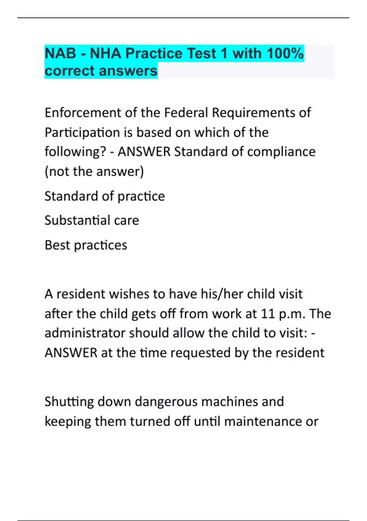 Enforcement of the Federal Requirements of Participation is based on which of the following? Standard of compliance (not the answer) Standard of practice Substantial care Best practices A resident wishes to have his/her child visit after the child gets off from work at 11 p.m. The administrator should allow the child to visit: at the time requested by the resident Shutting down dangerous machines and keeping them turned off until maintenance or service work is compete is an OSHA standard known as: lockout/tagout An activity program must be directed by a qualified professional who has: Completed eligibility for recreational therapy certification The role of the nursing facility Ombudsman is to: advocate for the resident (not the answer) review the resident's record observe resident care prioritize grievance For accurate accounting, inventories should be valued at: the average of the old supply value and the new supply value either cost or market value, whichever is lower (not the answer) the difference between the old supply value and the new supply value either cost or market value, whichever is higher Within how many days of completing a resident assessment must it be electronically transmitted to the CMS system? 14 To comply with the Code of Federal Regulations on the required posting of all nursing staff, an administrator should post: the total number of actual hours worked by the nursing department the previous day the total number of hours that staff are assigned to work each day a breakdown of staff and the actual hours they are working each shift (not the answer) a breakdown of hours for RNs and licensed practical/vocational nurses (LPNs/LVNs) The Occupational Safety and Health Administration (OSHA) requires form 300A to be displayed in which of the following months: February, March, April A new minimum data set (MDS) would be required when a resident: Is readmitted after suffering from a stroke The following are expenses for a Medicare Part A resident. Routine nursing care: $900 Therapy: $1,500 Attending Physician Visit: $300 Room: $3,000 Medications: $600 What is the cost per resident day if this resident is admitted and stays for 15 days? $420 Which of the following statements is correct with regard to a nursing facility's activity program for residents? Activities should be designed to meet the individual needs of each resident When must nursing facility residents be informed of their rights? Prior to or at the time of admission All of the following are examples of resident's rights except: Privacy for marital relations Which of the following types of insurance coverage is optional in a nursing facility? Business interruption insurance (not the answer) Property insurance Workers' compensation insurance Liability insurance The amount of time between a substantial evening meal and breakfast must not be more than how many hours? 14 The Life Safety Code requires which of the following to provide egress from the nursing facility? Two unobstructed, marked and unblocked exits If a resident has unresolved complaints about the food that is being served, which outside resource is mandated by the Older Americans Act to help resolve the complaint? Long Term Care Ombudsman