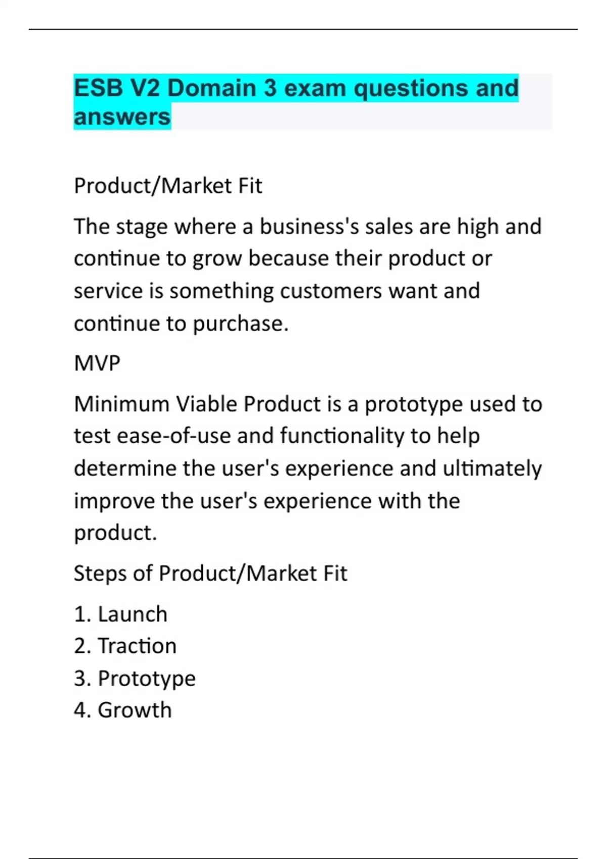 Product/Market Fit The stage where a business's sales are high and continue to grow because their product or service is something customers want and continue to purchase. MVP Minimum Viable Product is a prototype used to test ease-of-use and functionality to help determine the user's experience and ultimately improve the user's experience with the product. Steps of Product/Market Fit 1. Launch 2. Traction 3. Prototype 4. Growth 5. Monetization 6. Idea Value Hypothesis Promotes thing like product features, pricing, and a company's business model as a means of enticing potential customers to purchase the product. Quality Control Testing Process 1. Set quality standards 2. Establish the product quality testing method 3. Review the internal quality testing results 4. Refine and improve quality methods and measures, as needed Distribution Channel A method used to get a product from the manufacturer to the end-users. 2 Types of Distribution Channels 1. Direct 2. Indirect Distribution and Fulfillment Centers Store and ship products for businesses and are both indirect channels. Is Amazon a distribution center or fulfillment center? Fulfillment Center Is Macy's a distribution center or fulfillment center? Distribution Center Is DICK's Sporting Goods a distribution center or fulfillment center? Distribution Center Is Wayfair a distribution center or fulfillment center? Fulfillment Center Chamber of Commerce A local agency with information on participating local businesses. Employee An individual hired by a company and compensated for their work. Entrepreneur An individual who aspires to start and run a successful business. Ethical Practices Standards of professional conduct professionals should uphold. Forward-Thinking Mentality Thinking about and planning for the future. Grit The characteristic of being able to tackle goals with courage and perseverance. Initiative A characteristic in which an individual acts to turn ideas into action. Personal Agency One's ability to act to work toward achieving a goal. Problem-Solving The process of coming up with solutions to solve a problem. Revenue The number of sales and other income in a business for a given period. Sales Pitch A persuasive speech prepared to entice a potential customer to purchase a service or