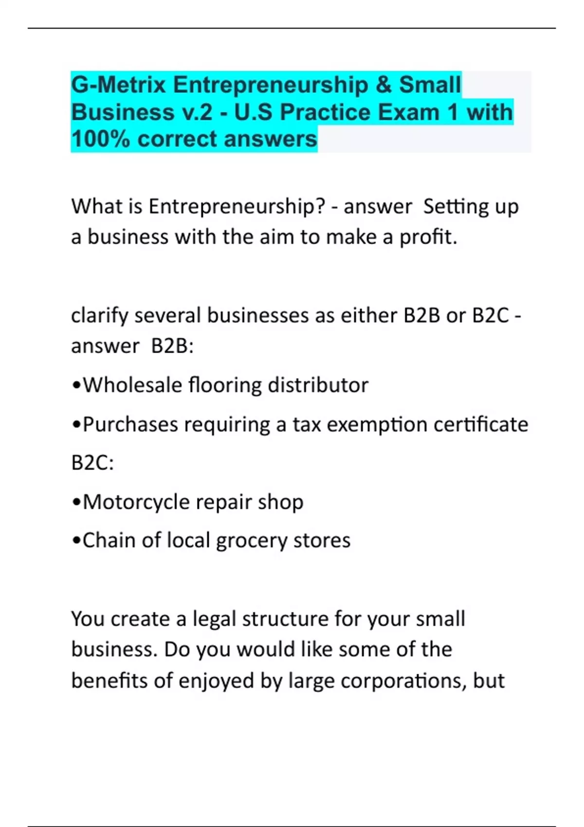 G-Metrix Entrepreneurship & Small Business v.2 - U.S Practice Exam 1 with 100% correct answers
