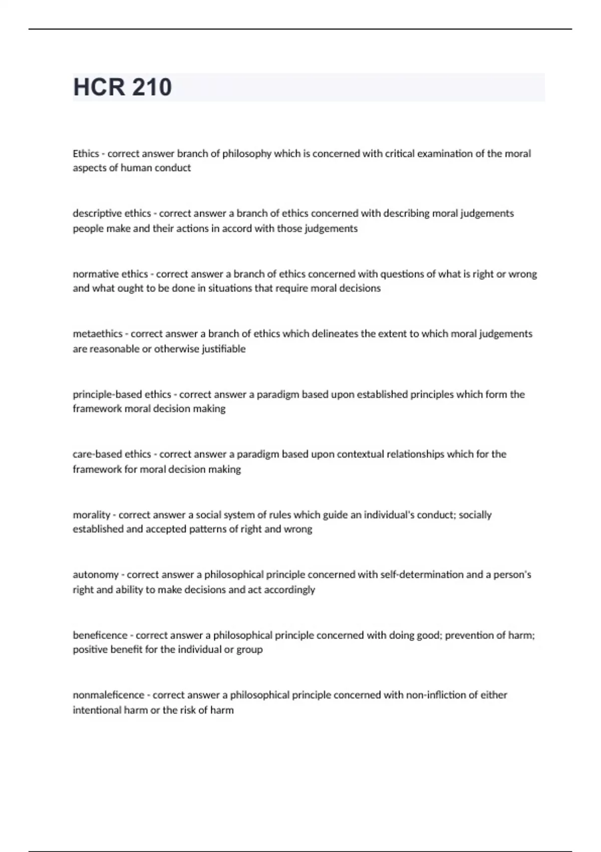 HCR 210 Arizona State University -HCR 210 questions n answers Ethics - correct answer branch of philosophy which is concerned with critical examination of the moral aspects of human conduct descriptive ethics - correct answer a branch of ethics concerned with describing moral judgements people make and their actions in accord with those judgements normative ethics - correct answer a branch of ethics concerned with questions of what is right or wrong and what ought to be done in situations that require moral decisions metaethics - correct answer a branch of ethics which delineates the extent to which moral judgements are reasonable or otherwise justifiable principle-based ethics - correct answer a paradigm based upon established principles which form the framework moral decision making care-based ethics - correct answer a paradigm based upon contextual relationships which for the framework for moral decision making morality - correct answer a social system of rules which guide an individual's conduct; socially established and accepted patterns of right and wrong autonomy - correct answer a philosophical principle concerned with self-determination and a person's right and ability to make decisions and act accordingly beneficence - correct answer a philosophical principle concerned with doing good; prevention of harm; positive benefit for the individual or group nonmaleficence - correct answer a philosophical principle concerned with non-infliction of either intentional harm or the risk of harm