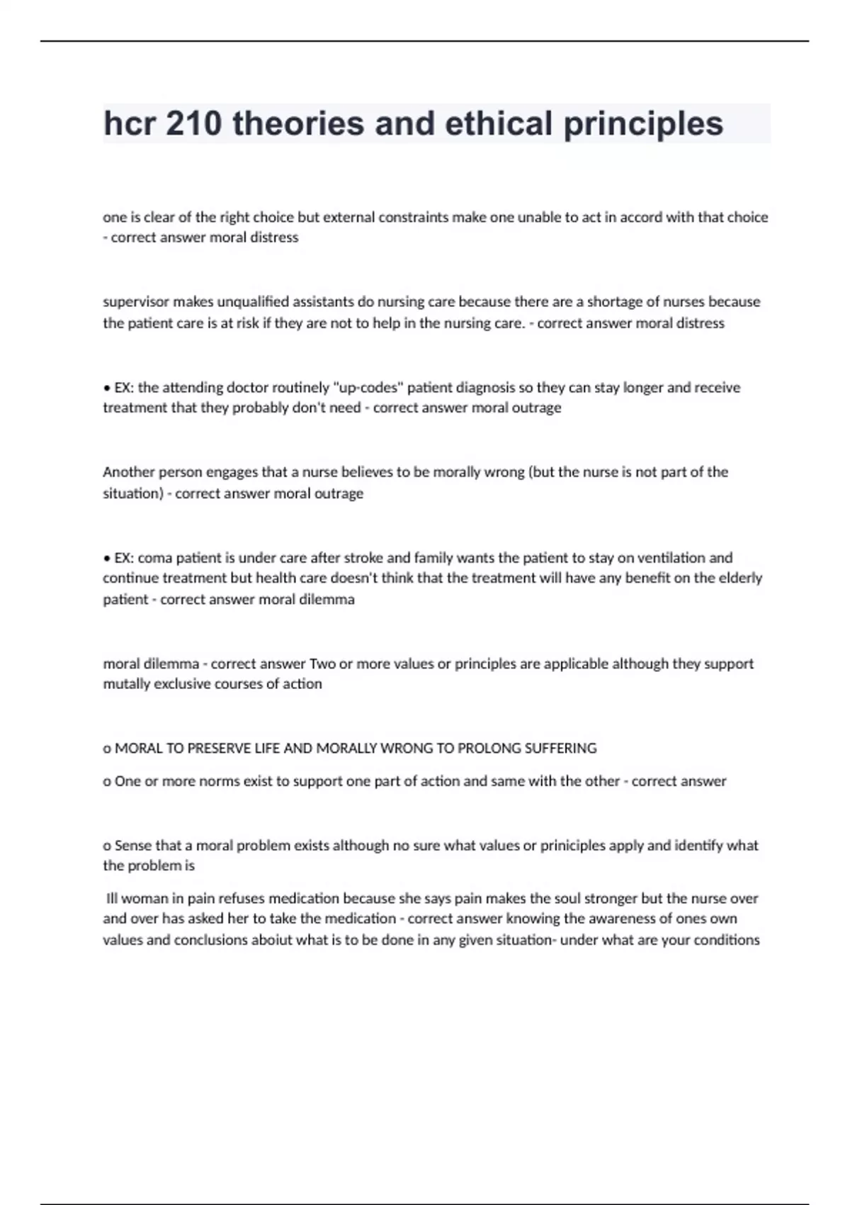 HCR 210 Arizona State University -hcr 210 theories and ethical principles well answered graded A+one is clear of the right choice but external constraints make one unable to act in accord with that choice - correct answer moral distress supervisor makes unqualified assistants do nursing care because there are a shortage of nurses because the patient care is at risk if they are not to help in the nursing care. - correct answer moral distress • EX: the attending doctor routinely "up-codes" patient diagnosis so they can stay longer and receive treatment that they probably don't need - correct answer moral outrage Another person engages that a nurse believes to be morally wrong (but the nurse is not part of the situation) - correct answer moral outrage • EX: coma patient is under care after stroke and family wants the patient to stay on ventilation and continue treatment but health care doesn't think that the treatment will have any benefit on the elderly patient - correct answer moral dilemma moral dilemma - correct answer Two or more values or principles are applicable although they support mutally exclusive courses of action o MORAL TO PRESERVE LIFE AND MORALLY WRONG TO PROLONG SUFFERING o One or more norms exist to support one part of action and same with the other - correct answer o Sense that a moral problem exists although no sure what values or priniciples apply and identify what the problem is Ill woman in pain refuses medication because she says pain makes the soul stronger but the nurse over and over has asked her to take the medication - correct answer knowing the awareness of ones own values and conclusions aboiut what is to be done in any given situation- under what are your conditions
