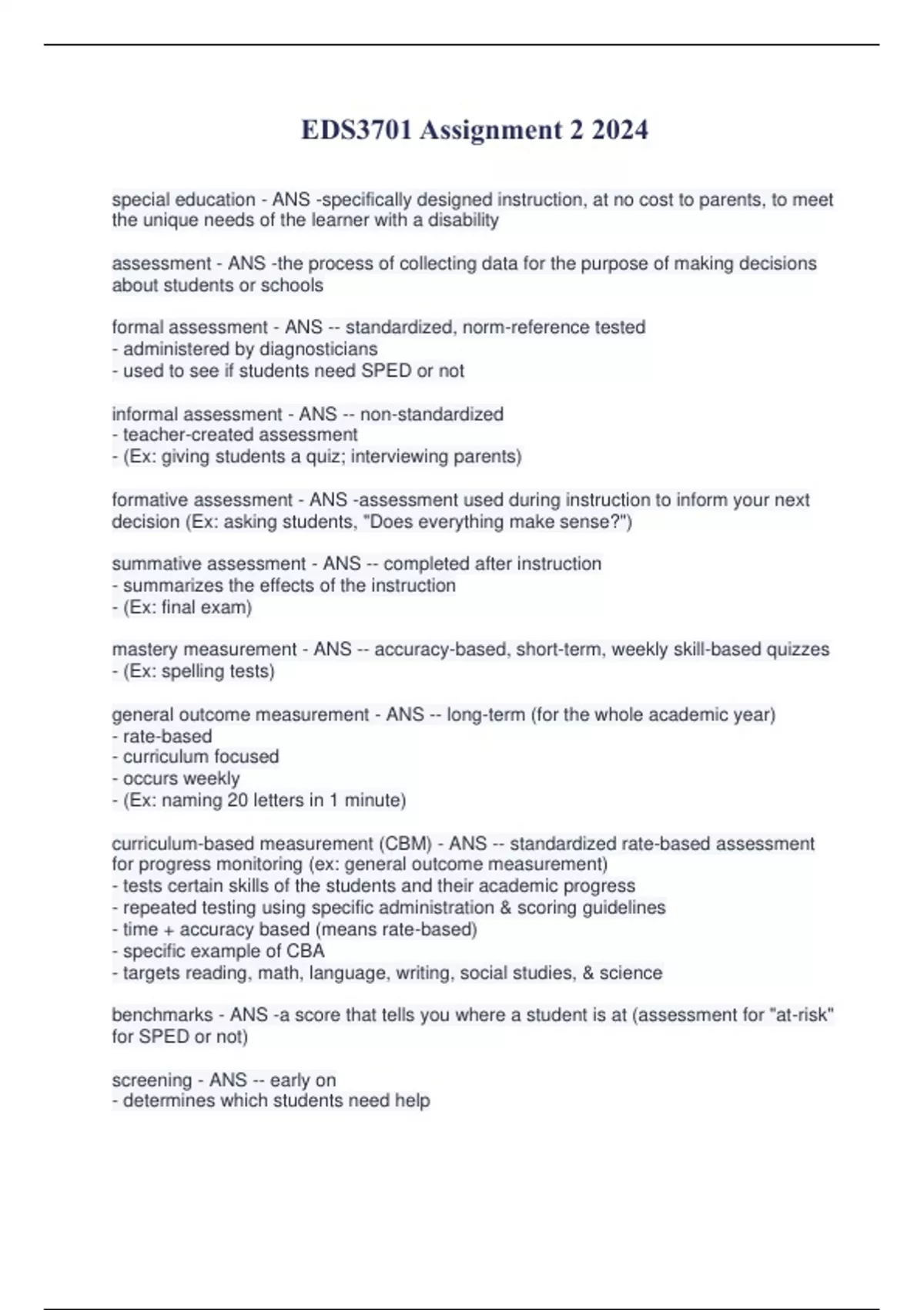 EDS3701 Assignment 2 2024 special education - ANS -specifically designed instruction, at no cost to parents, to meet the unique needs of the learner with a disability assessment - ANS -the process of collecting data for the purpose of making decisions about students or schools formal assessment - ANS -- standardized, norm-reference tested - administered by diagnosticians - used to see if students need SPED or not informal assessment - ANS -- non-standardized - teacher-created assessment - (Ex: giving students a quiz; interviewing parents) formative assessment - ANS -assessment used during instruction to inform your next decision (Ex: asking students, "Does everything make sense?") summative assessment - ANS -- completed after instruction - summarizes the effects of the instruction - (Ex: final exam) mastery measurement - ANS -- accuracy-based, short-term, weekly skill-based quizzes - (Ex: spelling tests)