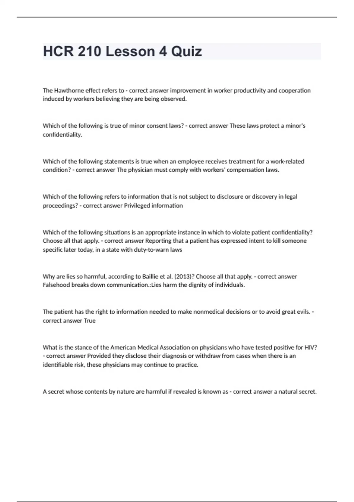 HCR 210 Arizona State University -HCR 210 Lesson 4 Quiz well answered The Hawthorne effect refers to - correct answer improvement in worker productivity and cooperation induced by workers believing they are being observed. Which of the following is true of minor consent laws? - correct answer These laws protect a minor's confidentiality. Which of the following statements is true when an employee receives treatment for a work-related condition? - correct answer The physician must comply with workers' compensation laws. Which of the following refers to information that is not subject to disclosure or discovery in legal proceedings? - correct answer Privileged information Which of the following situations is an appropriate instance in which to violate patient confidentiality? Choose all that apply. - correct answer Reporting that a patient has expressed intent to kill someone specific later today, in a state with duty-to-warn laws Why are lies so harmful, according to Baillie et al. (2013)? Choose all that apply. - correct answer Falsehood breaks down communication.:Lies harm the dignity of individuals. The patient has the right to information needed to make nonmedical decisions or to avoid great evils. - correct answer True What is the stance of the American Medical Association on physicians who have tested positive for HIV? - correct answer Provided they disclose their diagnosis or withdraw from cases when there is an identifiable risk, these physicians may continue to practice. A secret whose contents by nature are harmful if revealed is known as - correct answer a natural secret.