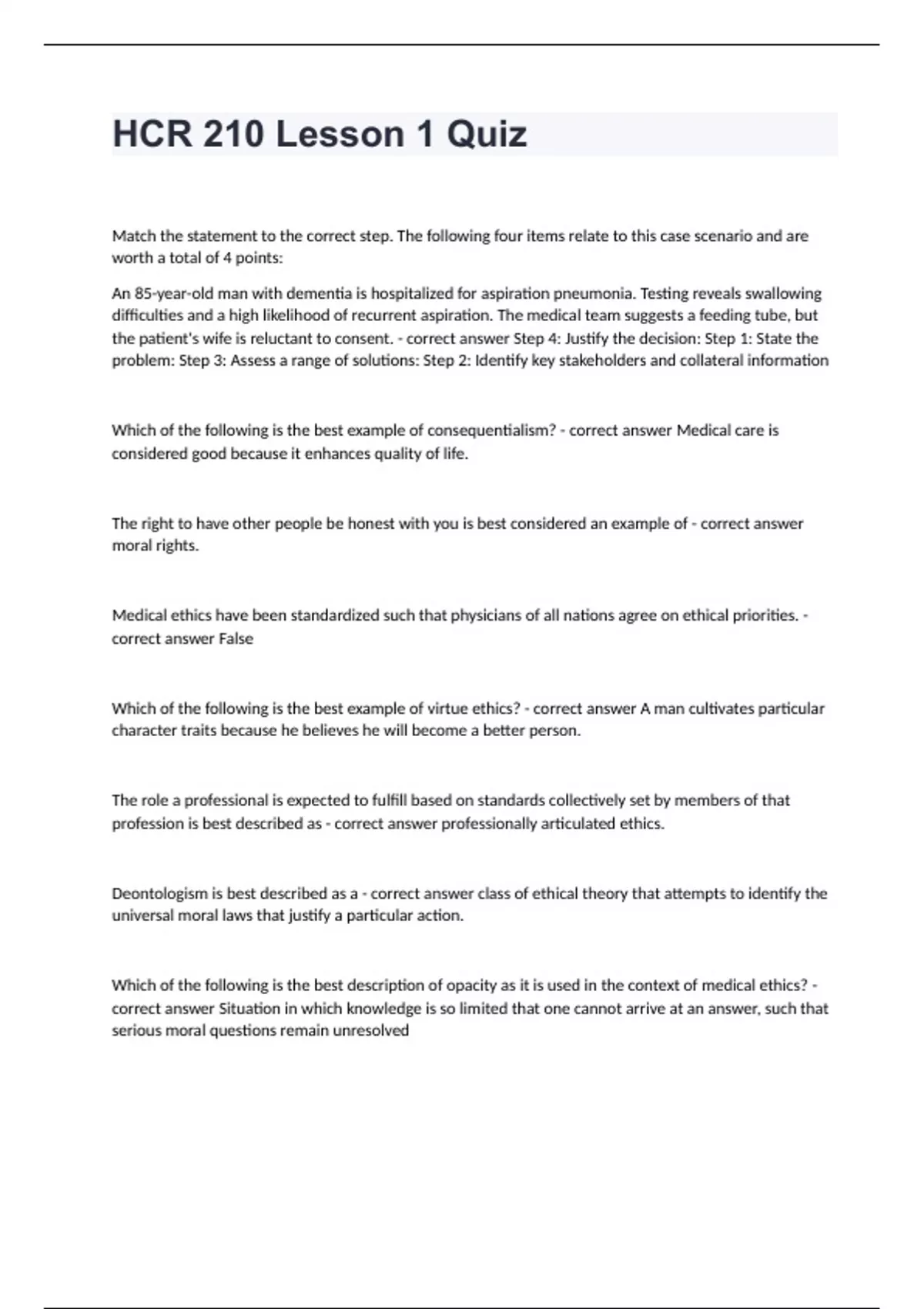 HCR 210 Arizona State University -HCR 210 Lesson 1 Quiz well answeredMatch the statement to the correct step. The following four items relate to this case scenario and are worth a total of 4 points: An 85-year-old man with dementia is hospitalized for aspiration pneumonia. Testing reveals swallowing difficulties and a high likelihood of recurrent aspiration. The medical team suggests a feeding tube, but the patient's wife is reluctant to consent. - correct answer Step 4: Justify the decision: Step 1: State the problem: Step 3: Assess a range of solutions: Step 2: Identify key stakeholders and collateral information Which of the following is the best example of consequentialism? - correct answer Medical care is considered good because it enhances quality of life. The right to have other people be honest with you is best considered an example of - correct answer moral rights. Medical ethics have been standardized such that physicians of all nations agree on ethical priorities. - correct answer False Which of the following is the best example of virtue ethics? - correct answer A man cultivates particular character traits because he believes he will become a better person. The role a professional is expected to fulfill based on standards collectively set by members of that profession is best described as - correct answer professionally articulated ethics. Deontologism is best described as a - correct answer class of ethical theory that attempts to identify the universal moral laws that justify a particular action. Which of the following is the best description of opacity as it is used in the context of medical ethics? - correct answer Situation in which knowledge is so limited that one cannot arrive at an answer, such that serious moral questions remain unresolved